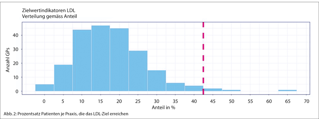 Beim LDL-Zielwert zeigte sich, dass nur ganz wenige Ärzte den Schwellenwert von mindestens 40 % erreichten, um mindestens 1 CARE-Score-Wert zu erreichen. Die grundsätzliche Erreichbarkeit wurde allerdings dadurch belegt, dass es 5 Ärzte gab, die 65 % oder mehr aus LDL-Zielwerten hatten. Abbildung 2 liefert ein differenziertes Bild der LDL-Zielwerterreichung. Hier zeigt sich, dass der Grossteil der Patient/-innen den Schwellenwert im LDL-Zielwert von mindestens 40 %, die auf LDL-Zielwert sind, nicht erreichen. Die meisten Hausärzt/-innen erreichen den LDL-Zielwert nur bei 10–20 % ihrer Patient/-innen.