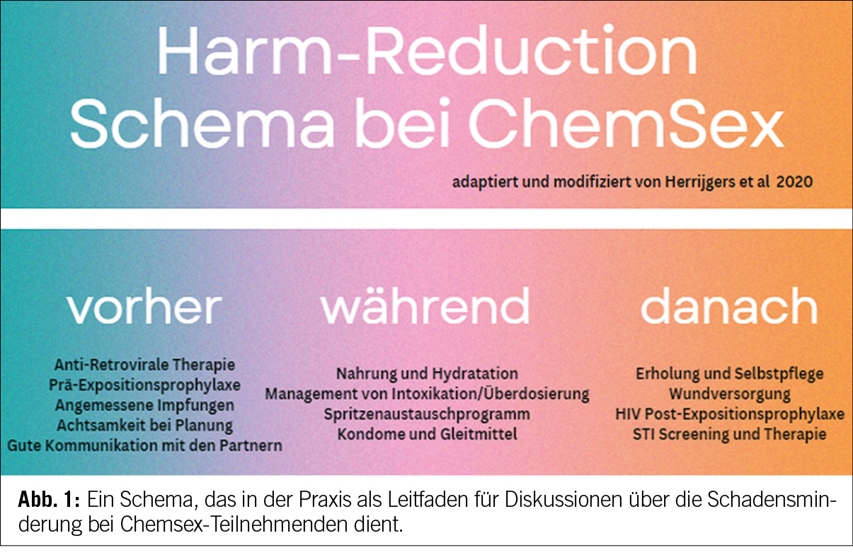 Der Begriff Chemsex entstammt der Gay-Community. Damit bezeichnet wird einerseits der Konsum bestimmter Substanzen (Chems) – meist sind damit Metamphetamin, Gammahydroxybuttersäure (GHB/GBL) und Mephedron gemeint – für ein besseres bzw. intensiveres Erleben der sexuellen Handlungen. Aber auch Arten der Initiierung der Sexualkontakte über spezielle Apps sind mitgemeint. Darüber hinaus umfasst der Begriff ein syndromales Risikoverhalten, ein impulsives Sexualverhalten, körperliche und sexuelle Gewalt, Inkaufnahme der Infektion mit sexuell übertragbaren Krankheiten sowie die mit dem Substanzkonsum verbundenen Risiken (1,2,3). Die durch die konsumierten Substanzen induzierte Enthemmung und das gesteigerte Selbstbewusstsein spielen dabei eine wichtige Rolle (4). Chemsex unterscheidet sich von anderen Formen des sexualisierten Drogenkonsums dadurch, dass es primär auf ein sexuelles Erlebnis ausgerichtet ist (2). Die Konsumprävalenz liegt bei 17% der homosexuellen Männer (MSM), welche eine Klinik für sexuelle Gesundheit aufsuchen und bei HIV-Infizierten ist sie höher (5). Viele Autoren schreiben den bekannten erhöhten Substanzkonsum bei homosexuellen Männern zum Teil einem mit sexueller Minderheit verbundenen Stress zu (6, 7). Es handelt sich um Themen wie Stigmatisierung, verinnerlichte Homophobie und gesellschaftliche Ablehnung (8). Angesichts des in der Forschung festgestellten Durchschnittsalters von circa 40 Jahren (9, 10) lässt sich die Hypothese aufstellen, dass Substanzen auch zur Aufrechterhaltung der Sexualität in einer Phase der schwindenden sexuellen Potenz angewendet werden. Die Präferenz der Substanz variiert erheblich je nach Literatur, Kultur und Standort, wobei in der Schweiz eine Neigung zu Methamphetamin und GHB/GBL besteht (11). US-amerikanische Daten zeigen einen Anstieg des Stimulanzienkonsums um 40% allein zwischen 2018 und 2019 sowie einen drastischen Anstieg der Todesfälle durch Stimulanzienüberdosierung (12). Ein deutlicher Anstieg des Metamphetaminkonsums über das letzte Jahrzehnt ist auch für die Schweiz nachweisbar (11).