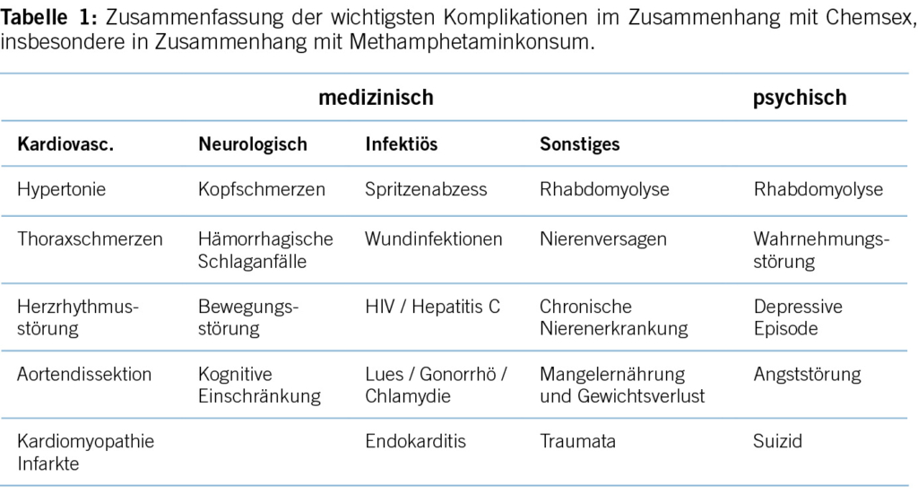Dieser Artikel befasst sich mit Chemsex im Allgemeinen und mit möglichen medizinischen und psychologischen Folgen des Verhaltens. Dargestellt werden zudem Red-Flags, die uns an das Vorhandensein spezifischer Risiken durch Chemsex denken lassen sollten und therapeutische Ansätze werden dargestellt. GHB/GLB verdient angesichts der lebensgefährlichen Überdosierung und der medizinischen Komplexität des Entzugssyndroms seine eigene Diskussion. Aus diesem Grund konzentriert sich der folgende Text auf die in der Schweiz am meisten verbreitete Substanz, Methamphetamin (Crystal Meth).