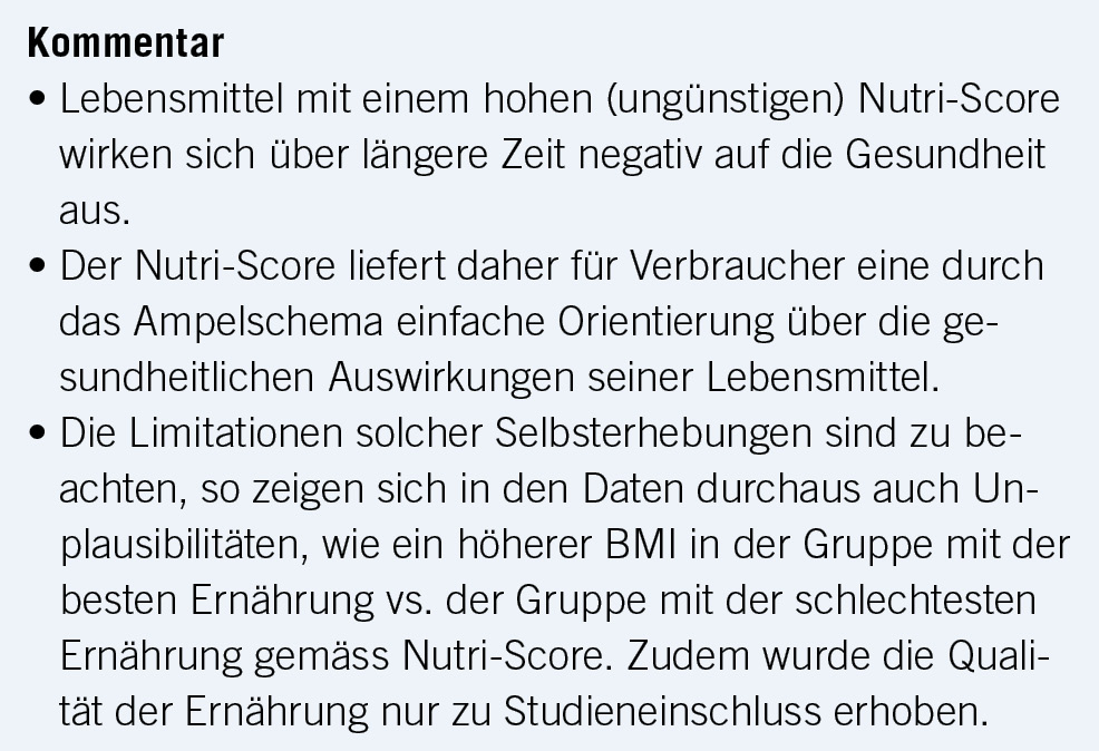Die Risikoerhöhung zeigte sich dabei wie folgt: Myokardinfarkt: 3 % (HR 1.03; CI 1.01–1.07), zerebrovaskuläre Ereignisse: 4 % (HR 1.04; CI 1.01–1.07), Schlaganfallrisiko: 4 % (HR 1.04; CI 1.01–1.07). Einzig die Gesamtzahl der koronaren Ereignisse stieg nicht signifikant an (HR 1.01; CI 0.99–1.03), hier wurden neben den Myokardinfarkten auch die Angina pectoris gezählt. Vergleicht man die Teilnehmer mit dem niedrigsten (günstigsten) Nutri-Score mit den Teilnehmern mit dem ungünstigsten (höchsten) Nutri-Score, so zeigten sich pro 100 000 Teilnehmer 364 versus 490 Ereignisse in 12.3 Jahren.