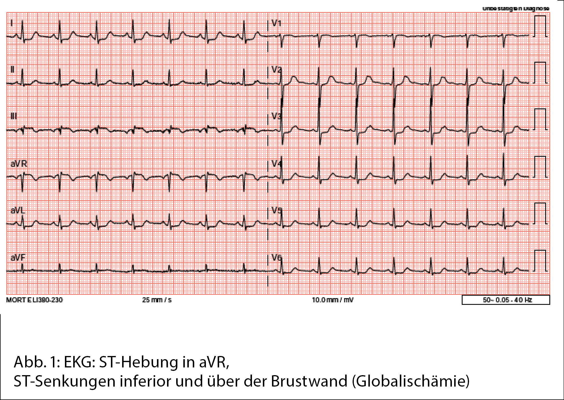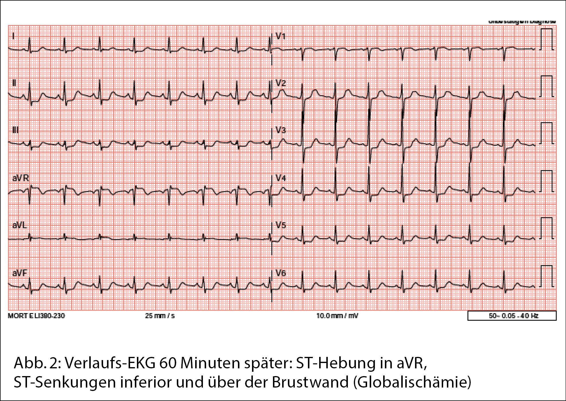 Laborchemisch konnte eine mässige Leukozytose sowie ein erhöhtes Kreatinin nachgewiesen werden. Troponin- T-Analyse und Blutalkoholspiegel ergaben Normalbefunde. Die Tryptase-Werte bei der Aufnahme waren normal. Nach einer zweiten intramuskulären Adrenalingabe zeigte die Patientin normotone Blutdruckwerte, und das Erythem war vollständig regredient. Im initialen Elektrokardiogramm (EKG) zeigten sich diffuse minimale ST-Senkungen (Abb. 1), welche in der Verlaufskontrolle nach einer Stunde viel deutlicher wurden und sich in einem Hauptstamm-EKG-Muster präsentierten (Abb. 2).