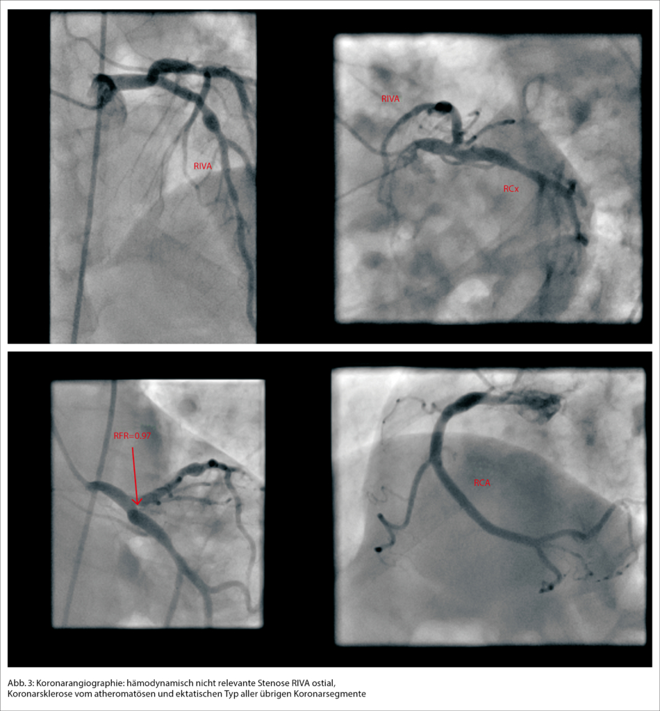 Die Patientin wurde zur weiteren Überwachung auf unsere Intermediate Care Station aufgenommen. In den folgenden Laborkontrollen stieg das kardiale Tro­ponin T deutlich an, was uns veranlasste, unser kardiologisches Team hinzuziehen, da wir ein akutes Koronarsyndrom befürchteten. Die Echokardiographie ergab eine normale Ejektionsfraktion und keinen Hinweis auf Wandbewegungsstörungen. In der Koronarangiographie imponierten die Koronargefässe mit lediglich einer moderaten Koronarsklerose ohne Stenosierung (Abb. 3). In Verbindung mit dem Hauptstamm-EKG wurde ein Koronarspasmus durch die Adrenalingaben postuliert, es zeigten sich in der Koronarangiographie jedoch keine Hinweise für eine höhere Spasmusneigung. Während des Krankenhausaufenthalts zeigten die Folge-EKGs eine Verbesserung der ST-Streckenveränderungen und schliesslich eine Normalisierung.