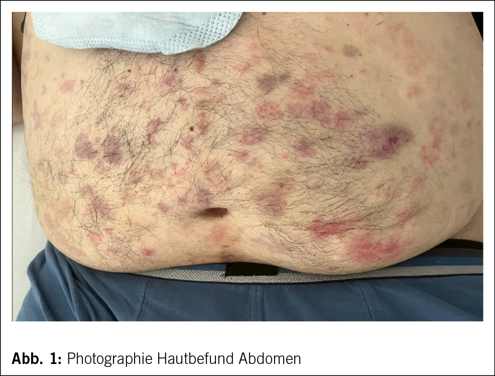 Zur differenzialdiagnostischen Abklärung wurden Blutkulturen und eine Urinkultur angelegt sowie eine parasitologische Stuhluntersuchung veranlasst. Die Ergebnisse waren allesamt ohne Erregernachweis. Ebenso verblieben alle infektiologisch relevanten Serologien (HIV, Hepatitis B/C, Lues-Screening, Quantiferontest) negativ. Ein Urinsediment war ohne Erythrozyturie, zeigte jedoch eine prärenale Proteinurie mit Hinweisen einer tubulären Schädigung. Die Nierenfunktion lag mit einer eGFR (CKD-EPI2009) mit 85 ml/min im Normalbereich. Die extern veranlassten Hautbiopsien demonstrierten das Bild einer Kleingefäss-vaskulitis mit ausgeprägter Eosinophilie und fibrinoiden Gefässnekrosen. Eine zwischenzeitlich durchgeführte Biopsie aus der unteren Nasenmuschel zeigte keinen Hinweis für eine Vaskulitis, Granulome oder eosinophile Entzündung. Eine initial geplante diagnostische Bronchoskopie wurde bei fehlender therapeutischer Konsequenz abgesagt. In einer TTE/TEE-Untersuchung ergab sich kein Hinweis für eine kardiale Manifestation der vermuteten Grunderkrankung. In einer ergänzenden Abdomensonographie ergab sich kein Anhalt einer abdominalen Organmanifestation, Lymphadenopathie oder Hepatosplenomegalie.
