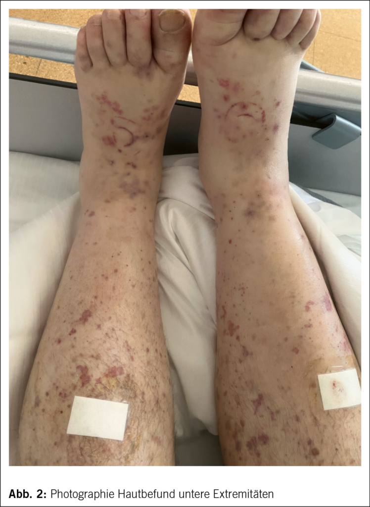 Bei Eintritt im Universitätsspital Zürich präsentierte sich ein 61-jähriger Patient in vermindertem, initial afebrilem Allgemeinzustand, kardiorespiratorisch stabil mit ausgeprägten bilateralen Unterschenkelödemen sowie leicht palpabler Purpura an Körperstamm und den unteren Extremitäten. Auskultatorisch imponierte ein 2/6 Systolikum mit punctum maximum über der Aortenklappe. Die Gelenke waren allseits schmerzfrei beweglich ohne palpable Synovitiden. Der Neurostatus war unauffällig. Im weiteren stationären Verlauf kam es zu täglichen Fieberepisoden bis max. 39.2 °C.