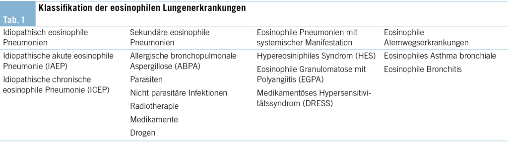 Die definitive Diagnosestellung im Akutstadium sowie die Abgrenzung der verschiedenen Krankheitsentitäten untereinander stellen eine klinische Herausforderung dar. Nach der Diagnosesicherung einer eosinophilen Lungenerkrankung gilt es im Abklärungsalgorithmus darum, einen möglichen Auslöser und eine extrapulmonale Organbeteiligung zu evaluieren. Folgende Kriterien definieren eosinophile Erkrankungen mit Lungenbeteiligung (2): periphere Eosinophilie (absolute Eosinophilenzahl ≥ 500 Eosinophile/µl) und Opazitäten in der pulmonalen Bildgebung. Erhöhter Eosinophilenanteil in der bronchoalveolären Lavage (> 10 %) und/oder histologischer Nachweis von eosinophilen Entzündungszellen in den Atemwegen oder dem Lungengewebe.