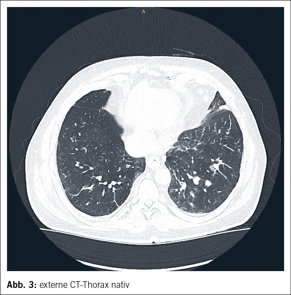 Ein 61-jähriger Mann wurde durch den Hausarzt bei Verdacht auf eine ambulant erworbene Pneumonie in ein wohnortnahes peripheres Spital zugewiesen. Neben purulentem Auswurf imponierten bei dortiger Aufnahme eine disseminierte leicht palpable Purpura (Abb. 1 und Abb. 2) mit enoraler Aussparung, ausgeprägte bilaterale Unterschenkelödeme sowie eine Bluteosinophilie von 3.1 G/l (0.0–0.7 G/l). In der CT-Thorax wurde eine basale Bronchiolitis mit weiteren bronchiolitischen Veränderungen im rechten Oberlappen ohne Konsolidationen oder Pleuraergüssen sowie Groundglass-Opazitäten in beiden Unterlappen nachgewiesen (Abb. 3). Eine antiinfektive Theapie mit Amoxicillin/Clavulansäure wurde initiiert, welche im Verlauf auf Ceftriaxon und Clarithromycin eskaliert wurde. Ausserdem veranlasste man eine Stanzbiopsie der Purpura im Bereich der streckseitigen Unterschenkel. Eine geplante diagnostische Bronchoskopie musste bei periinterventioneller hämodynamischer Instabilität und Sättigungsabfällen abgebrochen werden. Daraufhin erfolgte die Verlegung ins Universitätsspital Zürich zur weiteren pneumologischen Abklärung.