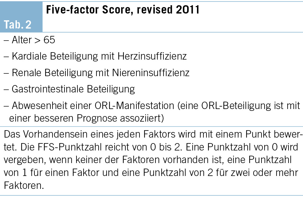 Das Therapieschema ist abhängig vom Schweregrad der Erkrankung. Dieser kann z.B. mittels Five-factor Score (Tab. 2) eingeschätzt werden (8). Die Induktionstherapie besteht aus Glucocorticoiden, welche bei schwerer Erkrankung mit Cyclophosphamid oder Rituximab kombiniert werden müssen. Mittels Glucocorticoid-Monotherapie konnte analog Ribi et. al (9) bei Fehlen von schlechten Prognosefaktoren in 93 % der Fälle eine Remission induziert werden, jedoch kam es hierbei zu einer Rezidivrate von 35 % im ersten Jahr. Durch eine Kombinationstherapie mit dem monoklonalen Interleukin-5-Antikörper Mepolizumab konnte eine signifikant längere Remissionsdauer mit konsekutiver Glucocorticoid-Einsparung erzielt werden (6). Alternativ ist eine Kombination von Glucocorticoiden und Azathioprin, Methotrexat oder Mycophenolat möglich. Die Behandlung mit Cyclophosphamid oder B-Zelldepletion ist schweren, organ- bzw. lebensgefährdenden Verläufen vorbehalten.