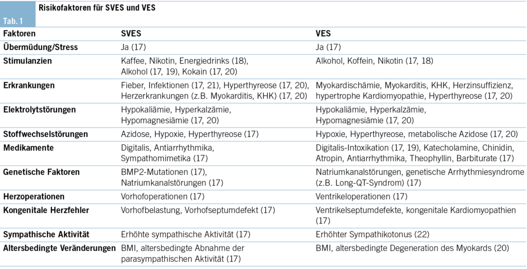 Extrasystolen können durch eine Vielzahl von Faktoren ausgelöst werden, die sowohl physiologische als auch pathologische Ursachen haben. Das Auftreten von Extrasystolen bei Sportlern kann durch einen erhöhten Vagotonus oder durch funktionell-strukturelle Veränderungen im Bereich des rechtsventrikulären Ausflusstraktes erklärt werden (15). Eine neuere Studie aus dem Jahr 2023 zeigt, dass das Volumen des epikardialen Fettgewebes bei Patienten mit häufigen VES unabhängig von anderen Faktoren grösser war als bei Kontrollpatienten. Ein grosses extrakardiales Fettvolumen war unabhängig mit hoher Symptomlast durch VES assoziiert (16).