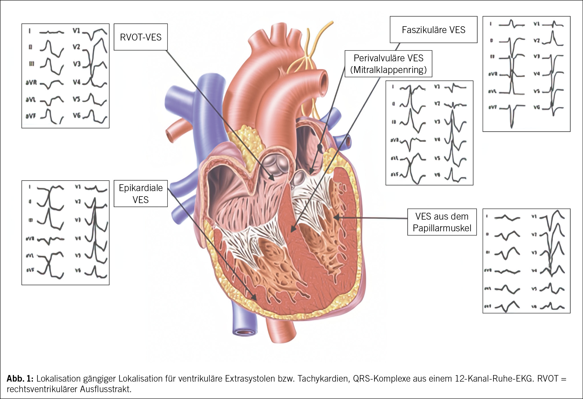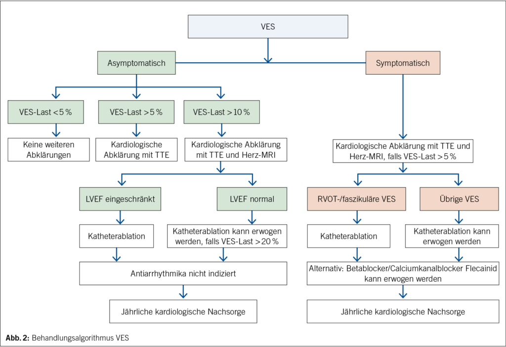 Sollte eine Herzerkrankung vorliegen, so ist diese entsprechend zu therapieren (9, 20). Bei einem Auftreten von ≥ 2 VES im Ruhe-EKG sollte ein Langzeit-EKG zur Bestimmung der Symptomlast erfolgen. Bei einer VES-Last von > 5 % oder bei Herzinsuffizienzsymptomatik sollte eine kardiologische Abklärung mit initialer Doppler-Echokardiographie zum Ausschluss einer VES-induzierten Kardiopathie respektive einer strukturellen Herzerkrankung erfolgen. In diesen Fällen wird anschliessend ein Herz-MRI zum besseren strukturellen Verständnis und zur ätiologischen Zuordnung empfohlen. Bei fehlendem Ansprechen auf eine kardiale Resynchronisationstherapie sollten Katheterablation oder Antiarrhythmika in Betracht gezogen werden (32).