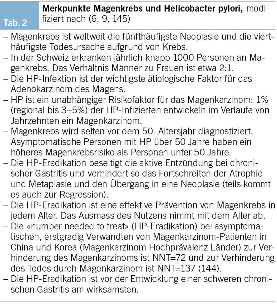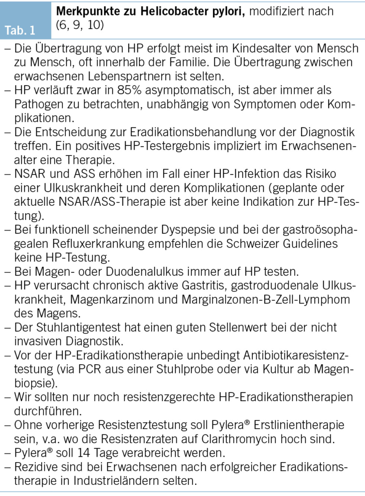 Mit diesem Artikel möchten wir den Hausärzt/-innen eine aktuelle, praktische Übersicht zu HP bei Erwachsenen bieten. In Tabelle 1 fassen wir die wichtigsten Merkpunkte zu HP zusammen, und es gibt empfehlenswerte Schweizer (8, 9), deutsche (10) und internationale (6, 11, 12) Guidelines und Übersichtsartikel (13, 14).