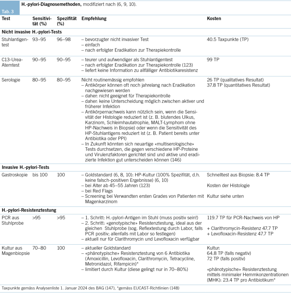 Siehe Tabelle 3. Die endoskopische («invasive») Abklärung mit Biopsie aus der Magenschleimhaut ist der Goldstandard. Die nicht invasiven Tests können ohne Endoskopie gemacht werden, sie sind kostengünstiger, aber weniger präzise als die Histologie. Wichtig: Antibiotika 4 Wochen und Protonenpumpeninhibitoren (PPI) 2 Wochen vorher absetzen (9).