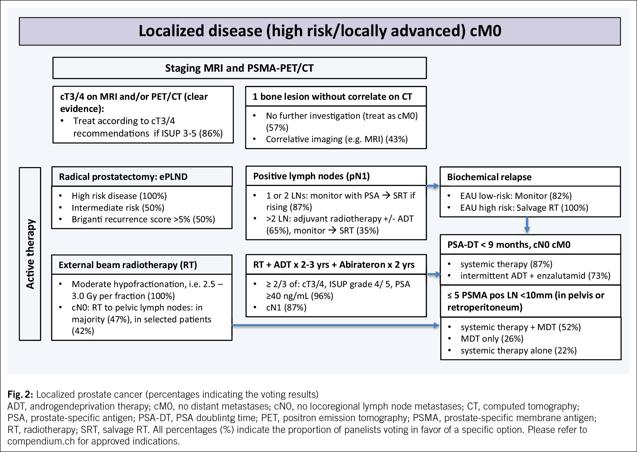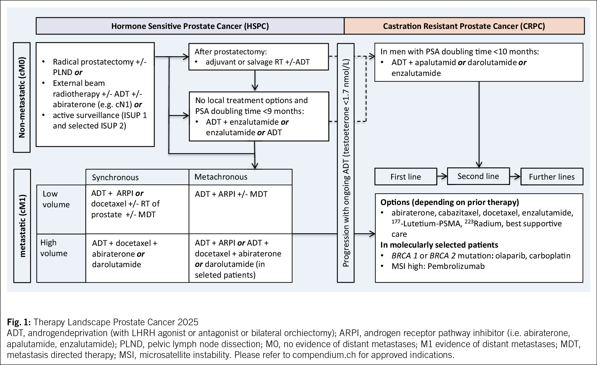 Prostate cancer is the most common malignancy in men and a leading cause of cancer deaths in Switzerland with around 7800 men newly diagnosed and 1360 dying from prostate cancer every year (1). Ongoing global efforts to improve outcomes for men with prostate cancer lead to an ever-growing body of evidence from clinical trials resulting in an increasing number of diagnostic and therapeutic strategies (Fig. 1). While in many cases treatment decisions may seem quite straight forward to those with a clinical focus on prostate cancer, this may be less so for those more involved in other areas of oncology and medicine. Furthermore, there remain several areas of uncertainty and debatable interpretation of data and their application to individual patients is not necessarily represented in clinical studies. To provide guidance for daily practice, the corresponding authors of this article organized a consensus meeting, which took place on August 15, 2024 in Bern, Switzerland. During this meeting, 63 pre-defined questions were discussed and voted on. The majority of these questions were selected from the international Advanced Prostate Consensus Conference (APCCC) 2024 (2), some were reformulated or adjusted to Swiss conditions to facilitate discussion, and some were newly added by the corresponding authors. All questions were circulated beforehand for preparation to all attending experts. The questions were discussed at the meeting and subsequently voted on. All votes were done electronically and anonymously. Consensus was defined if at least 75 % of all votes favored a specific answer; strong consensus needed an agreement of at least 90 % of votes. In cases of conflicts of interest or when not feeling adequately qualified to answer a question, it was recommended to vote “abstain”. Such votes were excluded for calculation of the percentages for the distribution of other answers. Assumptions applicable to all questions unless stated otherwise and the definitions of terms and treatment options can be found in the Supplementary Appendix online.