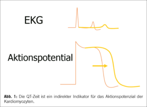 Das angeborene Long-QT-Syndrom ist eine genetische Erkrankung der Ionenkanäle (Kanalopathie), charakterisiert durch eine prolongierte ventrikuläre Repolarisation (QT- Zeit Verlängerung im Ruhe EKG, siehe Abbildung 1). Bei adrenerger Aktivierung kann diese verlängerte Repolarisation – insbesondere bei LQTS 1 und 2 – zu polymorphen ventrikulären Tachykardien bekannt als ,,Torsade de pointes” mit konsekutiven Synkopen bis hin zu einem plötzlichen Herztod führen können [1,2,3].