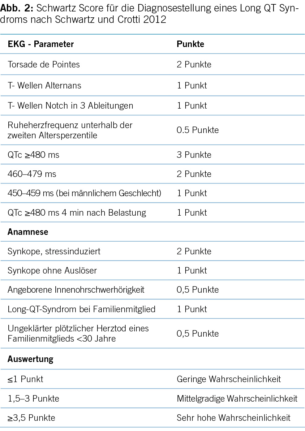 Die korrekte Diagnose des Long-QT-Syndroms (LQTS) basiert auf der herzfrequenzkorrigierten QT-Zeit (QTc), einer Reihe anderer elektrokardiographischer Parameter sowie Informationen aus der Anamnese und Familienanamnese und ggf. der genetischen Untersuchung. Diagnosekriterien nach Schwartz et al. sind state-of-the-art. Wichtig ist zudem das Fehlen von strukturellen Herzerkrankungen, QT-Zeit verlängernden Medikamenten (siehe Abbildung 2) und anderen prädisponierenden Faktoren wie Hypokaliämie [4,5,6].