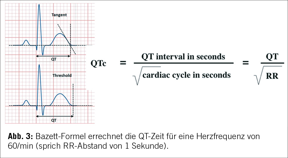 Es gibt verschiedene Methoden zur Messung der QT-Zeit, die zu unterschiedlichen Grenzwerten führen, in der Literatur am besten validiert ist die Bazett- Formel (siehe Abbildung 3). Darüber hinaus sollte, obwohl die U-Welle bei LQTS-Patienten ebenfalls abnorm sein kann, die U-Welle nicht in die QT-Zeit Messung einbezogen werden [6].