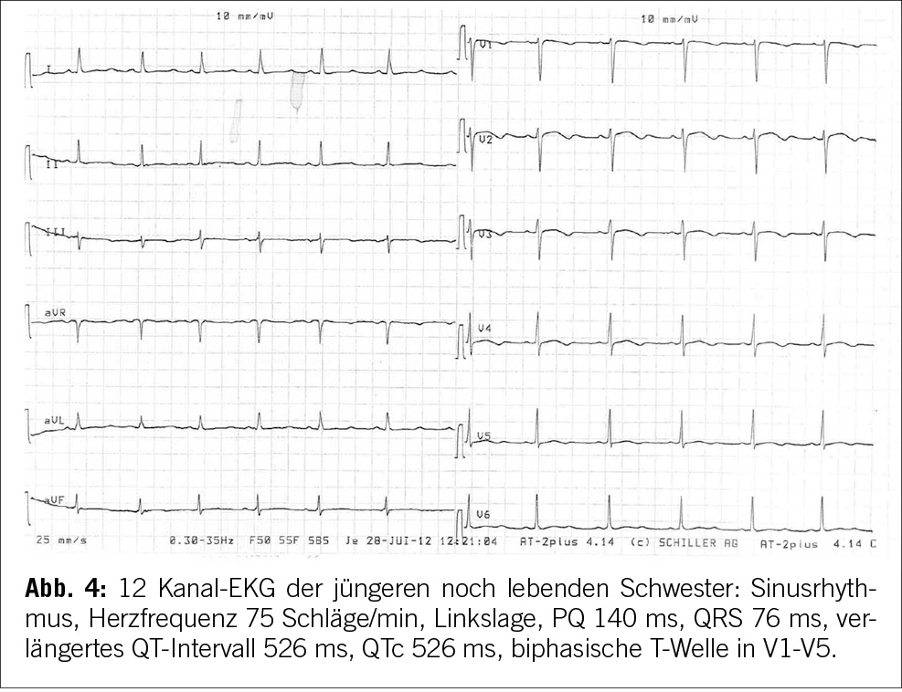 Unsere Patientin hatte zwei Schwestern, von denen eine im Jahr 2012 im Alter von 17 Jahren plötzlich in einem Skilager in den Anden im Schlaf verstarb. 3 Monate vor ihrem Tod erlitt die Schwester unserer Patientin eine Synkope. Die Synkope ereignete sich während des Tages beim Aufstehen vom Mittagstisch, die Schwester verlor plötzlich das Bewusstsein. Während dieses Vorfalls knirschte sie mit den Zähnen, atmete nicht und zeigte tonisch-klonische Bewegungen, die insbesondere die oberen Gliedmaßen betrafen. Offenbar hatte sie keinen tastbaren Puls, aber nach 2 externen Beatmungen erlangte sie das Bewusstsein zurück und erholte sich rasch. Sie wurde in einem örtlichen Krankenhaus in der Schweiz untersucht und ein EKG zeigte eine ausgeprägte Verlängerung des QT-Intervalls von über 500 ms und morphologische Abnormalitäten der T-Welle in mehreren Ableitungen. Ein Holter-Monitor zeigte ebenfalls eine Verlängerung des QT-Intervalls und morphologische Abnormalitäten der T-Welle. Es wurde jedoch keine Diagnose gestellt, wenige Monate danach verstarb die Schwester.