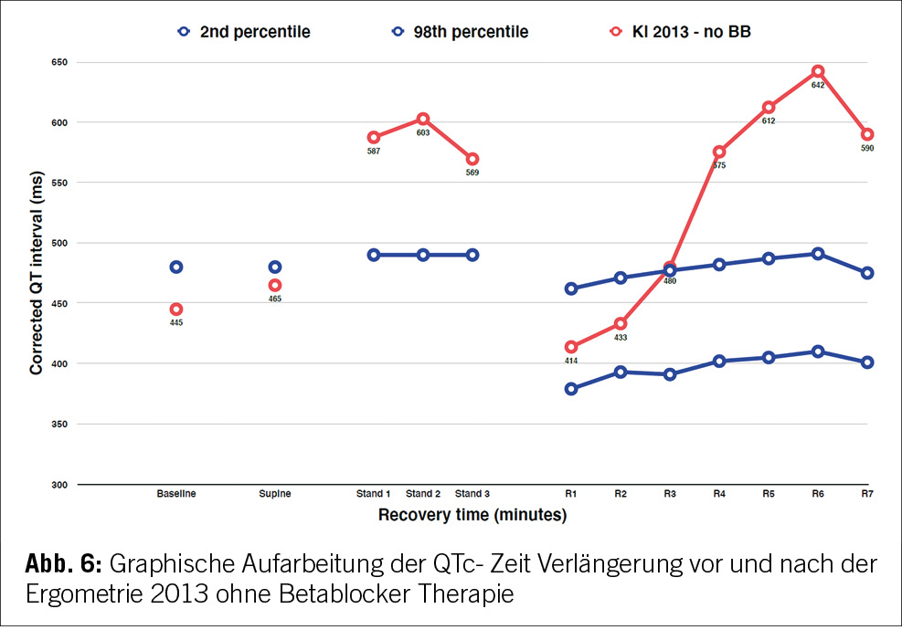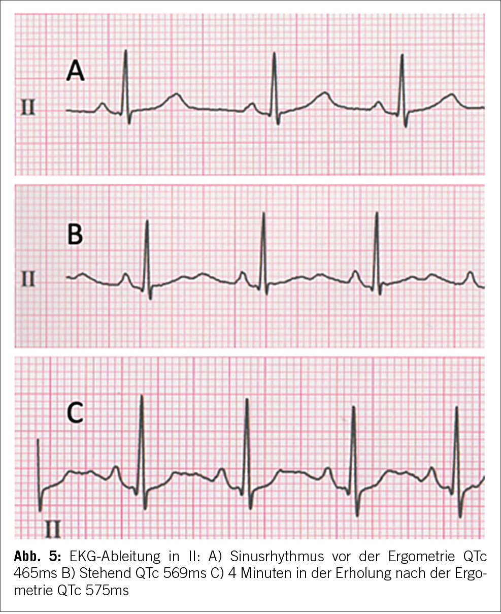Die Patientin wies eine normale QT-Zeit im Ruhezustand auf. Signifikante QT-Zeit Verlängerungen und T-Wellen- Abnormalitäten traten beim Stehen und während der Erholung nach körperlicher Anstrengung auf. Dies deutete auf ein verborgenes Long-QT-Syndrom hin, das durch einfache Manöver manifest wurde. Die T-Wellen-Morphologie war mit einem Long-QT-Typ 2 vereinbar (Abbildung 5).