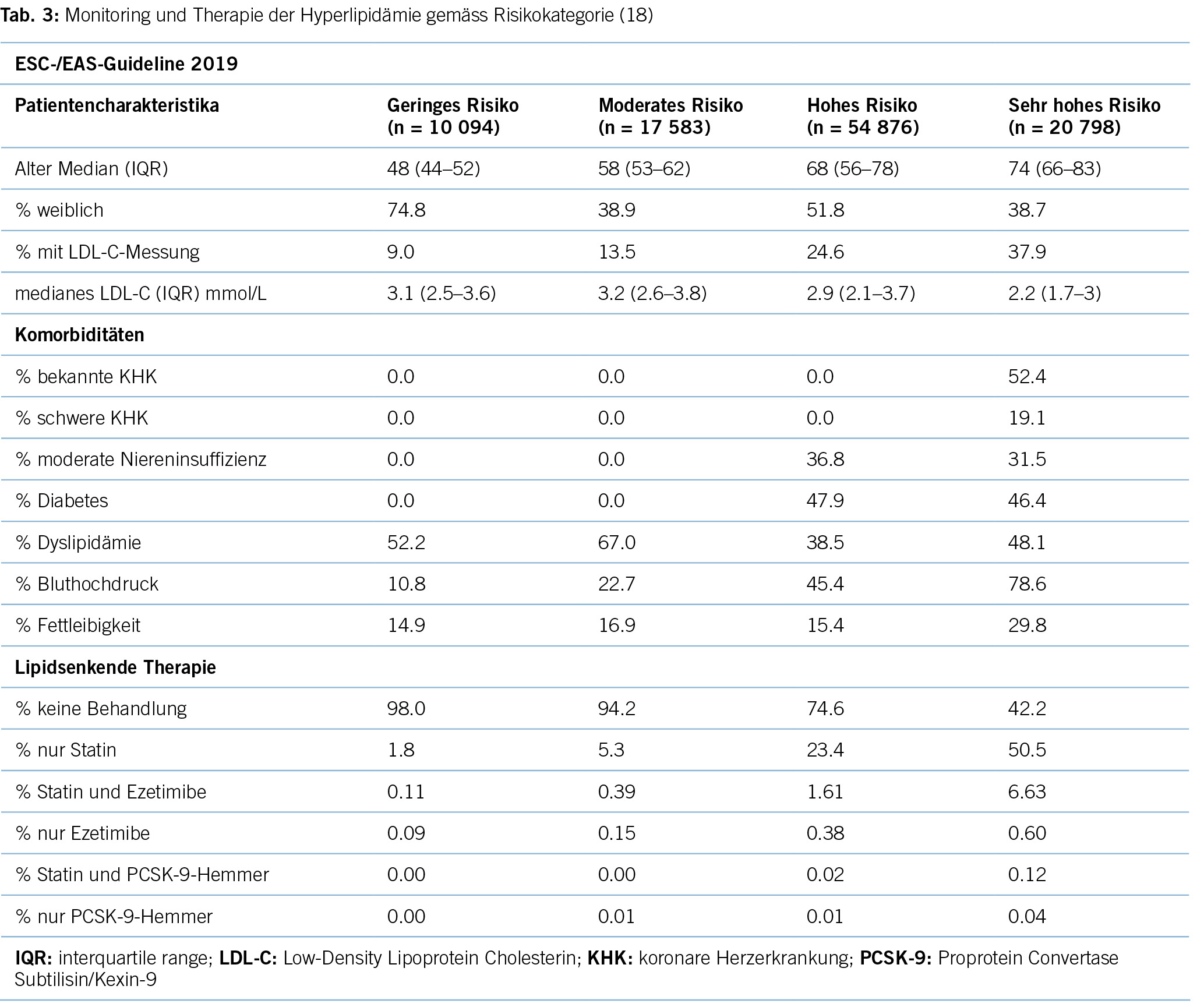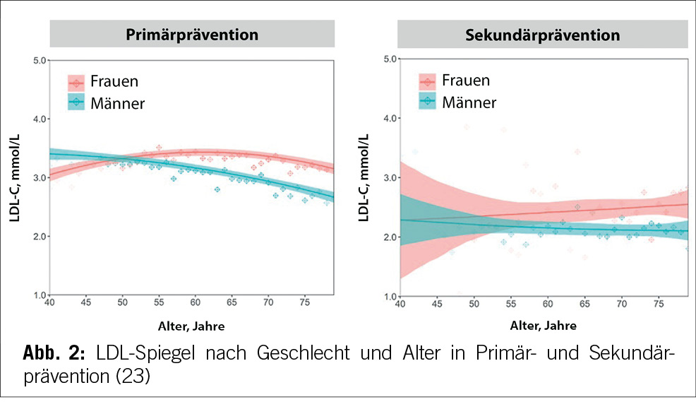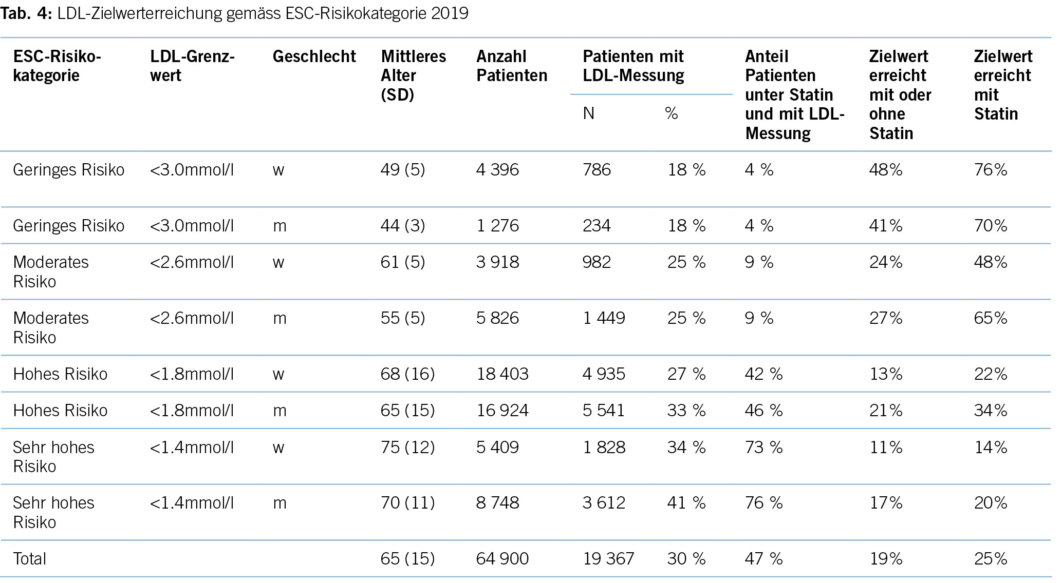 Erhöhtes LDL-Cholesterin ist für 20,7 % aller kardio­vas­kulären Erkrankungen und rund 5 % aller kardiovaskulären Todesfälle verantwortlich. Im Hinblick auf das Risiko, einen Myokardinfarkt zu erleiden, ist das LDL-Cholesterin der bedeutsamste Risikofaktor mit etwa 12 % attribuiertem Risiko (10). Gemäss BFS und SGB betrug die Prävalenz der Hyperlipidämie (erhöhte LDL-Cholesterinspiegel) in der Schweizer Bevölkerung im Jahre 2017 12,5 %. Bemer­kens­wert ist insbesondere der Anstieg seit dem Jahre 2002, als in der Gesundheitsbefragung nur 8,8 % von einem erhöhten Cholesterinspiegel berichtet hatten. Innert 15 Jahren war somit ein Anstieg von relativ betrachtet 42 % zu verzeichnen. Dies dürfte neben einem tatsächlich höheren Anteil an Menschen mit erhöhten Cholesterinspiegeln aufgrund einem höheren Anteil älterer Menschen auch einer erhöhten Awareness für die Hyperlipidämie geschuldet sein. Die Euro­päische Gesellschaft für Kardiologie (ESC) differenziert aufgrund vorliegender Risikofaktoren zwischen verschie­denen kardiovaskulären Risikokategorien, und damit gehen verschiedene Zielwerte im LDL-Cholesterinspiegel einher. Hinsichtlich der Therapie der Hyperlipidämie entsprechend der Risikokategorieeinteilung der ESC-Guideline 2019 zeigt sich folgendes Bild (17) (Tabelle 3): Es wird deutlich, dass bereits das Monitoring der Hyper­lipidämie verbesserungsfähig ist: So wird selbst in der höchsten Risikokategorie nur in 37,9 % der Fälle mindestens einmal pro Jahr das LDL-C bestimmt. Immerhin 42,2 % dieser Risikokategorie erhält keine lipidsenkende Therapie. Der mediane LDL-C-Wert in der höchsten Risikokategorie beträgt 2,2 mmol/l (IQR: 1,7–3,0) und liegt damit über dem ESC-Zielwert von 1,4 mmol/l. Betrachtet man die Zielwerterreichung der LDL-Choles­terinwerte gemäss den Zielen der ESC-Guideline 2019, so ergibt sich ein Bild gemäss Tabelle 4. Insgesamt erreichen nur 19 % aller Patient/-innen die Zielwerte, und selbst unter Statintherapie sind dies nur 25 %, was darauf hinweisen könnte, dass im Falle einer lipidsenkenden Therapie zu wenig potente Statine oder eine zu geringe Dosis verabreicht werden. Diese geringe Zielwerterreichung ist nicht nur spezifisch für die Schweiz, ähnliche Werte ergaben auch Studien aus Deutschland, obwohl dort seit mehr als einem Jahrzehnt entsprechende nationale Disease-Management-Programme (DMPs) etabliert sind (19).  Zu berücksichtigen ist, dass die ESC-Guideline aus dem Jahre 2019 deutlich tiefere LDL-Grenzwerte vorsieht als die vorangegangene Leitlinie aus dem Jahre 2016. Erfahrungs­gemäss gibt es eine Übergangszeit, bis neue Grenzwerte in die tägliche Praxis überführt werden (20). Allerdings zeig­ten auch die Zielerreichungsgrade mit Berücksichtigung der Zielwerte aus der ESC-Guideline 2016 keine besseren Ergebnisse (18). Eine aktuelle Auswertung aus dem Schweizer FIRE-Netzwerk, einem Forschungsnetzwerk, in das über 700 Hausärzt/-innen ihre Daten aus der elek­tronischen Krankenakte einspeisen und das Daten bis Ende 2021 einschloss, zeigte überdies keine signifikant besseren Ergebnisse. Die Annahme, dass die Implementierung neuer Zielwerte nur eine gewisse Zeit erfordert, zeigt sich somit nicht bestätigt (21). Bezüglich der Implementierung von Evidenz mittels finanzieller Anreize im Sinne einer leist­ungs­abhängigen Vergütung zeigten Studien, die den Diabetes mellitus adressierten, dass der Höhepunkt der Verbesserung bei einer Incentivierung von Zielerreichungs­graden etwa nach 18 Monaten erreicht wird (22). Bemerkenswert und alarmierend zugleich ist auch die Tatsache, dass bei Frauen das LDL-C als Risikofaktor im Vergleich zu Männern signifikant unterbehandelt wird. Während es bei Blutdruckeinstellung und HbA1c-Werten keine Gendergap gibt, erreichen Frauen sowohl in der Primär- als auch in der Sekundärprophylaxe mit zuneh­mendem Alter und damit dem Rückgang der protektiven Östrogene klinisch relevant höhere LDL-Spiegel, Abbildung 2 (23). Diese werden aber in der Primär- wie Sekundär­prävention nicht adäquat adressiert. Erhöhtes LDL-Cholesterin ist in den High-Income-Ländern für etwa 20,7 % aller kardiovaskulären Erkrankungen ver­antwortlich (11), was in der Schweiz einem Verlust von 64,445 (0,207 x 311,332) DALYs entspricht. LDL-Cholesterin ist für etwa 16 % aller Herzinfarkte verantwortlich, was etwa 1,000 vermeidbare Herzinfarkte in der Schweiz im Falle einer optimalen Lipidtherapie bedeuten würde. Sozioöko­nomisch entspricht dies gemäss WifOR 2021 einem ver­meid­bareren Schaden von 6,4 Mrd. USD (16).