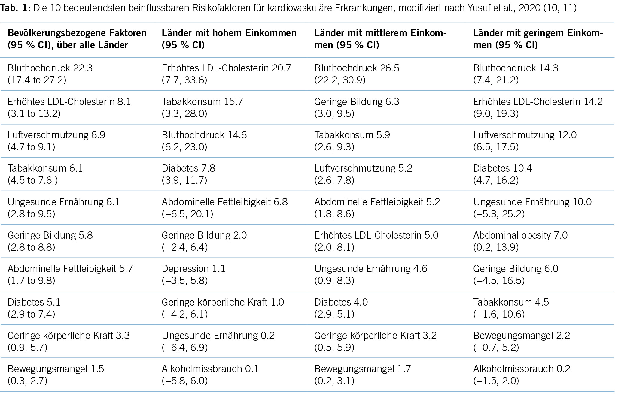 Zahlreiche Studien zeigen eine Diskrepanz zwischen der medizinischen Evidenz respektive den Leitlinienvorgaben und der Primär- und Sekundärprävention in der täglichen Praxis, die dazu führt, dass viele Patient/-innen eine suboptimale Behandlung erhalten (8). Es resultieren unzureichend kontrollierte kardiovaskuläre Risikofaktoren und damit einhergehend vermeidbare kardiovaskuläre Ereignisse respektive eine vermeidbare Krankheits- und Mortalitätslast und direkte und indirekte Kosten (9). Kardiovaskuläre Erkrankungen zeichnen sich dadurch aus, dass die bedeutendsten Risikofaktoren durch Lebensstilmassnahmen oder medikamentöse Interventionen wirksam beeinflussbar sind. Tabelle 1 zeigt die bedeutendsten kardiovaskulären Risikofaktoren, wie sie von Yusuf und Mitarbeitern im Lancet 2020 herausgearbeitet wurden (10).