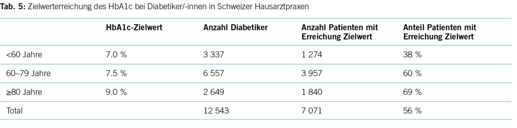 Eine aktuelle Auswertung aus der FIRE-Datenbank mit Routinedaten aus 770 Hausarztpraxen (21) (Tabelle 5) mit 12 543 Patient/-innen zeigt, dass zwar 56 % aller Diabe­tiker/-innen die altersadaptierten Grenzwerte unterschrei­ten, dies liegt aber vor allem daran, dass in höherem Le­bens­alter höhere Grenzwerte angesetzt werden. In der Risikogruppe der unter 60-jährigen, für die ein Grenzwert von 7,0 % im HbA1c gilt, sind es vergleichsweise geringe ­