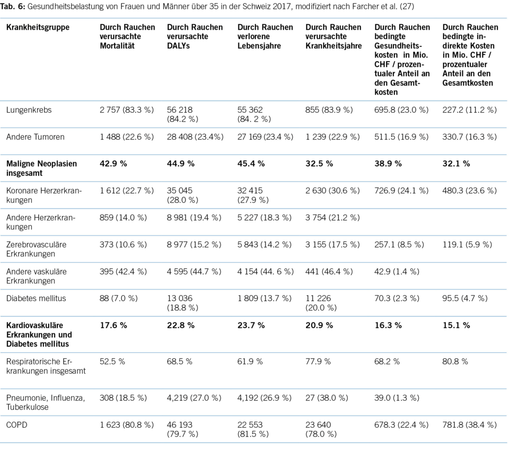 Gemäss einer aktuellen Schweizer Studie von Farcher und Mitarbeitern aus dem Jahre 2023 ist Rauchen für den Verlust von 47 639 DALYs im Jahre 2017 verantwortlich (27).