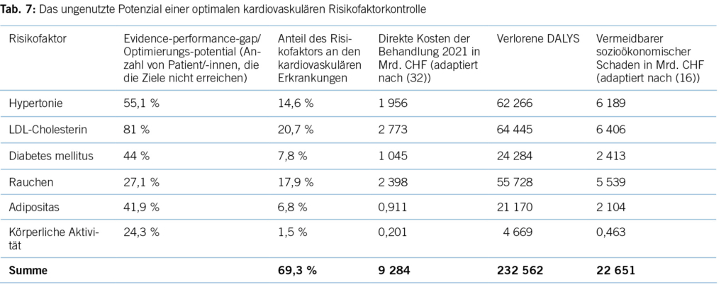 Tabelle 7 zeigt das Potenzial für individuelle Gesundheit, ausgedrückt in DALYs, und der vermeidbare ökonomi­sche Schaden bei einer optimalen Umsetzung der der­zeitigen Leitlinienempfehlungen im Hinblick auf die Kontrolle kardiovaskulärer Risikofaktoren in der Schweiz. Eine Änderung des Lebensstils könnte etwa 30 % aller verlorenen DALYs vermeiden, während medikamentöse Interventionen für etwa 70 % des DALY-Potenzials stehen. Auch wenn man keine vollständige Adhärenz auf Patient/-innenseite erwarten kann, ist das Optimierungspotenzial erheblich.