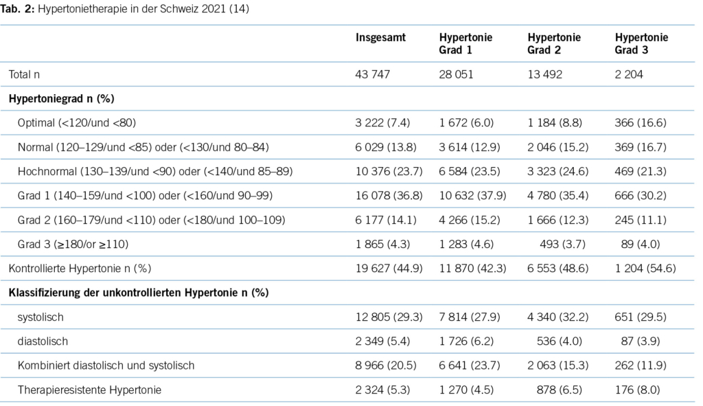 Gemäss einer Studie aus dem Jahre 2016 (9), die insgesamt 22 434 Hypertoniker/-innen in Schweizer Hausarztpraxen erfasste, haben 72,7 % dieser Patient/-innen mindestens eine Hypertonie Grad 1, also Werte über 140–159 mm HG. 16,3 % aller Hypertoniker/-innen haben zudem einen Blutdruck in der höchsten Blutdruckkategorie mit Werten von über 180 mm HG systolisch (13).