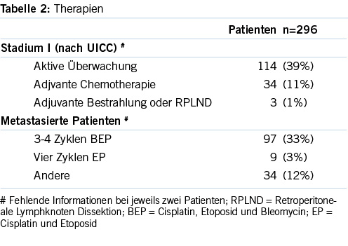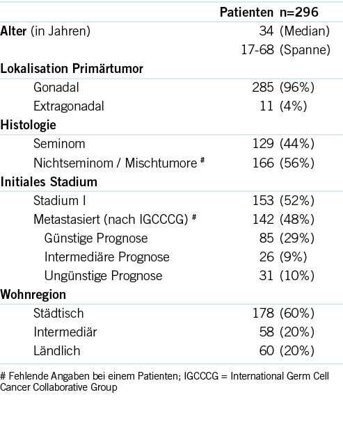 Die Patientenkohorte umfasste insgesamt 296 Patienten. Details zu den Patientencharakteristika findet sich in Tabelle 1. Etwa die Hälfte der Patienten befanden sich in einem klinischen Stadium I mit auf den Hoden beschränkter Erkrankung. Die übrigen Patienten waren zum Diagnosezeitpunkt bereits metastasiert allerdings zumeist in einer günstigen Prognosegruppe nach der IGCCCG Klassifikation.