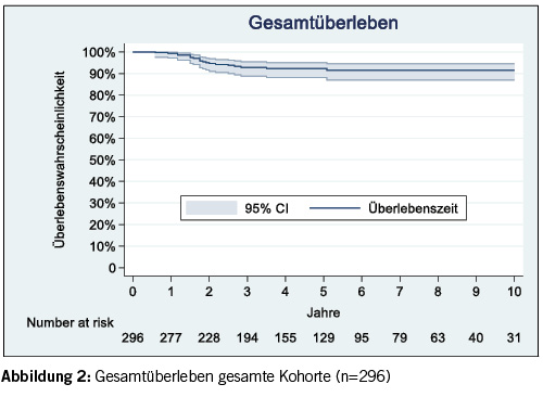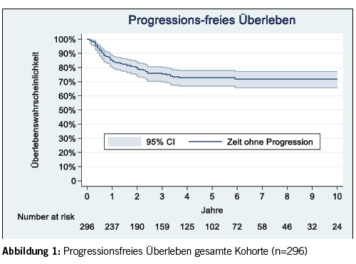 Patienten wurden im Median 49 Monate nachbeobachtet (Interquartile Range 25-85 Monate). Zum Zeitpunkt der letzten Nachbeobachtung waren 272/296 (92%) Patienten krankheitsfrei und 21/296 (7%) Patienten waren verstorben, bei 3/296 (1%) war die Nachsorge abgebrochen. Die Todesursache war bei 12 Patienten die Tumorerkrankung, bei 4 Patienten verblieb die Todesursache unklar, 5 starben an anderen Ursachen. Die progressionsfreie Überlebenswahrscheinlichkeit nach 3 und 5 Jahren betrug für die gesamte Kohorte 76% bzw. 73%, die Gesamtüberlebenswahrscheinlichkeit nach 3 und 5 Jahren betrug 93% (Abbildung 1).
