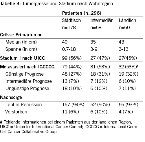 Allerdings berichteten Hölzel et al 1991 in einer viel beachteten Veröffentlichung von einem erheblichen Stadt-Land Gefälle mit schlechteren Behandlungsergebnissen in ländlichen Regionen in Deutschland selbst 10 Jahre nach Zulassung von Cisplatin. [3] Wir stellten uns die Frage, ob ein solches Stadt-Land Gefälle in der Schweiz heute noch existiert. Zu diesem Zweck untersuchten wir eine Kohorte konsekutiver Patienten, die in den Jahren 2010 bis 2020 am Inselspital Bern diagnostiziert und behandelt wurden, hinsichtlich Tumorgrösse und Stadium bei Primärpräsentation sowie Behandlungserfolg abhängig von der Wohnregion der Patienten.