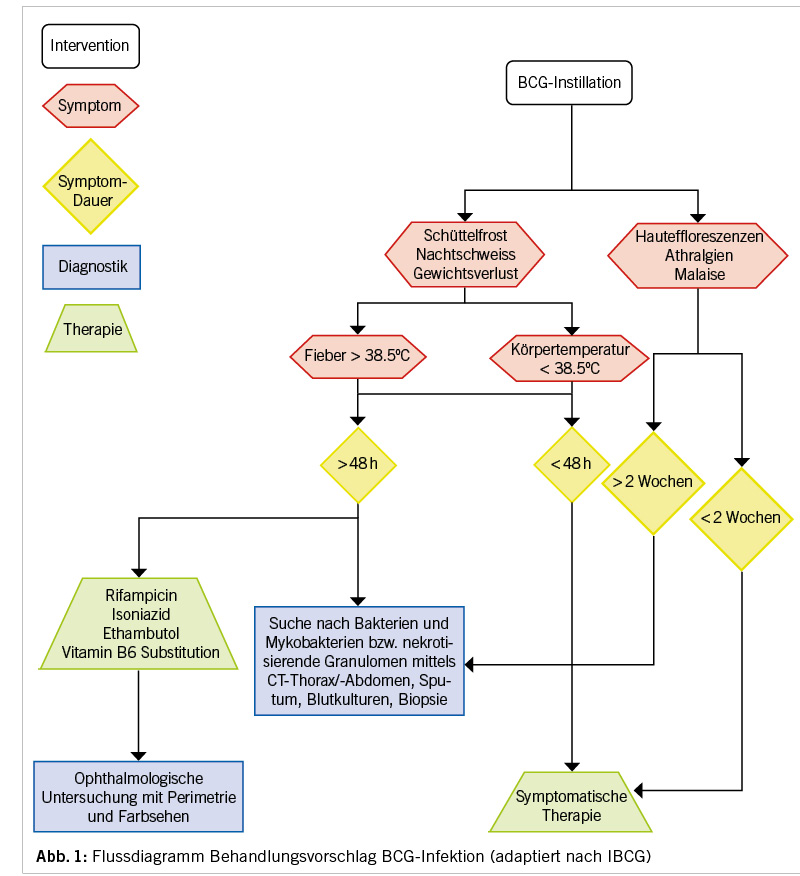 Die BCG-Instillation gehört zur Standardtherapie des oberflächlichen Urothelkarzinoms der Blase. Hierbei sind ernsthafte unerwünschte Nebenwirkungen insgesamt selten. Die Diagnose eines disseminierten BCG-Infektes kann vermutet werden, sobald nach Instillationen mindestens zwei Tage Fieber mit systemischen und/oder lokalen Organmanifestationen (ausgenommen urogenitale Beschwerden) unter Ausschluss anderer Ursachen bestehen und ein rasches Ansprechen auf eine tuberkulostatische Therapie zu beobachten ist. Ein direkter Erregernachweis ist nicht obligat, da oft nicht erfolgreich; häufiger gelingt der Nachweis von Granulomen. Eine BCG-Infektion soll mit Isoniazid, Rifampicin und Ethambutol für sechs Monate behandelt werden.