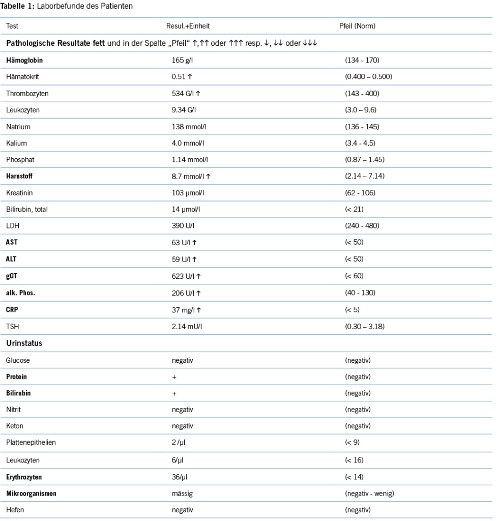 Laborchemisch zeigten sich eine Erhöhung der Transaminasen und der Gamma-Glutamyltransferase sowie der alkalischen Phosphatase. Das CRP war erhöht.