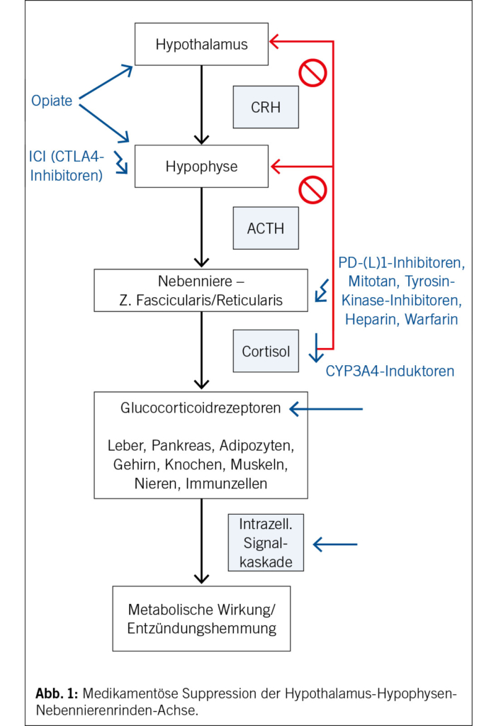 Glucocorticoide werden seit den 1950er-Jahren dank ihrer immunmodulatorischen Wirkung für autoim­mune, entzündliche, onkologische oder immunologische Erkrankungen sowie bei transplantierten Patienten in unterschiedlicher Darreichungsform angewendet. Leider sind auch die damit assoziierten Nebenwirkungen nicht vernachlässigbar. Bereits bei einer täglichen Therapie mit 20–30 mg Cortisol-äquipotenten Präparaten besteht bei einer Langzeitanwendung ein erhöhtes Risiko für die Entwicklung von Diabetes mellitus Typ 2, Osteoporose mit pathologischen Frakturen, arterieller Hypertonie, Infektionen, gastrointestinalen Erkrankungen (z. B. Ulkusleiden), thromboembolischen Ereignissen und einer erhöhter Gesamtmortalität (11). Zudem besitzen alle Glucocorticoidpräparate das Potenzial, entweder durch systemische Gabe oder durch systemische Resorption nach First-Pass-Effekt, die HHN-Achse zu supprimieren. Nach dem Absetzen der GC erholt sich die Hypophysenfunktion als Erstes, während die vollständige Erholung der Nebennierenfunktion mehrere Monate bis Jahre dauern kann. Das Risiko der Entstehung einer sekundären NNI ist von diversen Einflussfaktoren abhängig, welche vor Verschreibung von Glucocorticoiden berücksichtigt werden sollten (12).