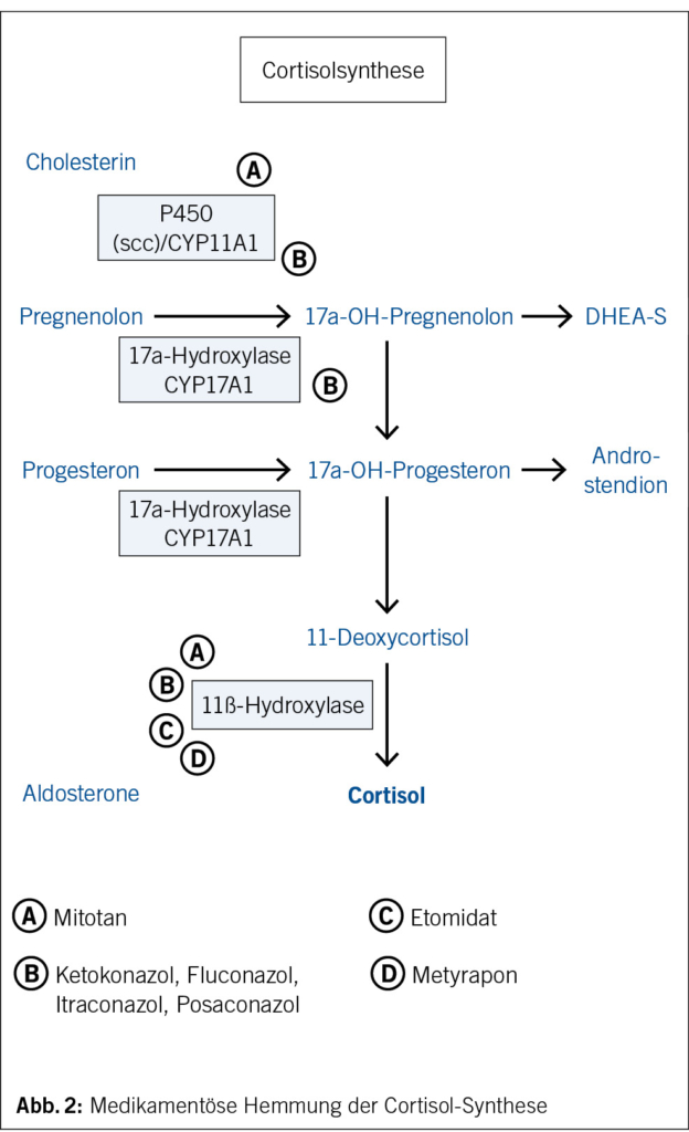 Die HHN-Achse wird zentral von Stressfaktoren und Tageslicht stimuliert und durch ein negatives Feedback bei Anstieg der Cortisolproduktion supprimiert (Abb. 1). Eine medikamentös induzierte Nebenniereninsuffizienz (NNI) kann auf hypothalamisch-hypophysärer Ebene, durch direkte Medikamenteneffekte auf die Nebennieren oder durch Interferenz mit den Glucocorticoidrezeptoren entstehen (1). Eine direkte Schädigung der Nebennierenrinde, z. B. durch eine Autoimmunreaktion (unter ICI gegen PD-1/PD-L1), Hämorrhagie (unter Heparin, Warfarin, Tyrosin-Kinase-Inhibitoren) oder Zytotoxizität (Mitotan), kann zu einer primären NNI führen. Ebenso kann die Cortisolsynthese auf enzymatischer Ebene durch verschiedene Medikamente, unter anderem Azole (Ketonazol, Itraconazol, Fluconazol, Posaconazol), gehemmt werden (Abb. 2). Andere Substanzen (z. B. Mifepriston) können die Glucocorticoidrezeptoren oder die GC-abhängige Gentranskription (Chlorpromazin und Imipramin) blockieren. Ein vermehrter Cortisolmetabolismus durch Induktoren des CYP3A4s (z. B. Phenobarbital, Rifampicin, Phenytoin, Carbamazepin …) kann zudem zu einer Reduktion des zirkulierenden Cortisols führen. Bei einer zentralen NNI hingegen wird die Sekretion vom Corticotropin-Releasing-Hormon (CRH) und adrenocorticotropen Hormon (ACTH) in Hypothalamus und Hypophyse supprimiert, was im Verlauf zu einer Atrophie der Nebennierenrinde und somit zu einer verminderten Produktion von GC und Androgenen (Dehydroepiandrosteronsulfat oder DHEAS) führt. Diese kann im Rahmen einer immunvermittelten Hypophysitis unter ICI (vor allem Anti-CTLA4) durch die inhibitorische Wirkung von Opiaten auf die CRH- und ACTH-Sekretion sowie, am häufigsten, durch die Stimulation des negativen Feedbacks durch supraphysiologische Dosen exogener GC oder GC-ähnlicher Medikamente (Megestrolacetat) auftreten (2, 3).