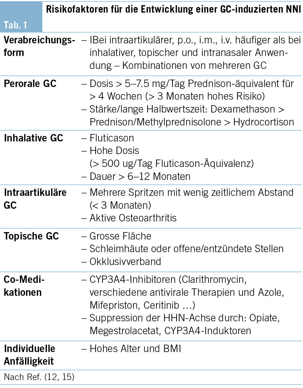 Das höchste Risiko für die Entwicklung einer NNI nach exogenen GC besteht unter peroraler oder intraartikulärer Gabe mit einer Prävalenz von ca. 49 % und 52 % (Tab.1). Mittels inhalativer, topischer und intranasaler Präparate liegt diese allerdings unter 10 % (6). Bei peroraler Therapie ist das Risiko von der Frequenz der Gaben (erhöhtes Risiko bei mehreren/abendlichen Gaben) (13) und der Gesamtexposition (Dosis > 5–7.5 mg/Tag Prednison-äquivalent, Dauer länger als vier Wochen und höhere Stärke/Halbwertzeit) abhängig. Unter inhalativen Glucocorticoiden konnte ein hohes Risiko unter Fluticason (aufgrund der längeren Halbwertszeit und hoher Rezeptoraffinität), hohen Dosen (> 500 ug/Tag Fluticason-äquivalent) und bei einer Dauer von länger als sechs Monaten (bei mittlerer/hoher Dosis bzw. zwölf Monaten mit jeder Dosis) gezeigt werden. Nach wiederholten intraartikulären Injektionen oder bei aktiver Osteoarthritis (aufgrund der erhöhten Durchblutung und somit der erhöhten systemischen Absorption) ist ebenso das Risiko für eine NNI erhöht. Für topische Präparate besteht ein erhöhtes Risiko insbesondere bei Applikation auf eine grosse Hautfläche, Schleimhäute oder offene/entzündete Stellen. Unabhängig von den verordneten Präparaten können die Patienten eine unterschiedliche Anfälligkeit für eine sekundäre NNI entwickeln (12). Adipöse oder ältere Patienten sowie Patienten mit cushingoiden Zügen nach GC-Therapie oder nach bereits stattgehabter Addison-Krise sind besonders gefährdet (14). Des Weiteren können bestimmte Medikamente (z. B. CYP3A4-Inhibitoren) durch die Erhöhung der systemischen GC-Exposition oder andere Substanzen mit supprimierender Wirkung auf die HHN-Achse (z. B. Opiate, Megestrolacetat, CYP3A4- Induktoren …) die Cortisolkonzentrationen beeinflussen und somit eine sekundäre NNI begünstigen (12).