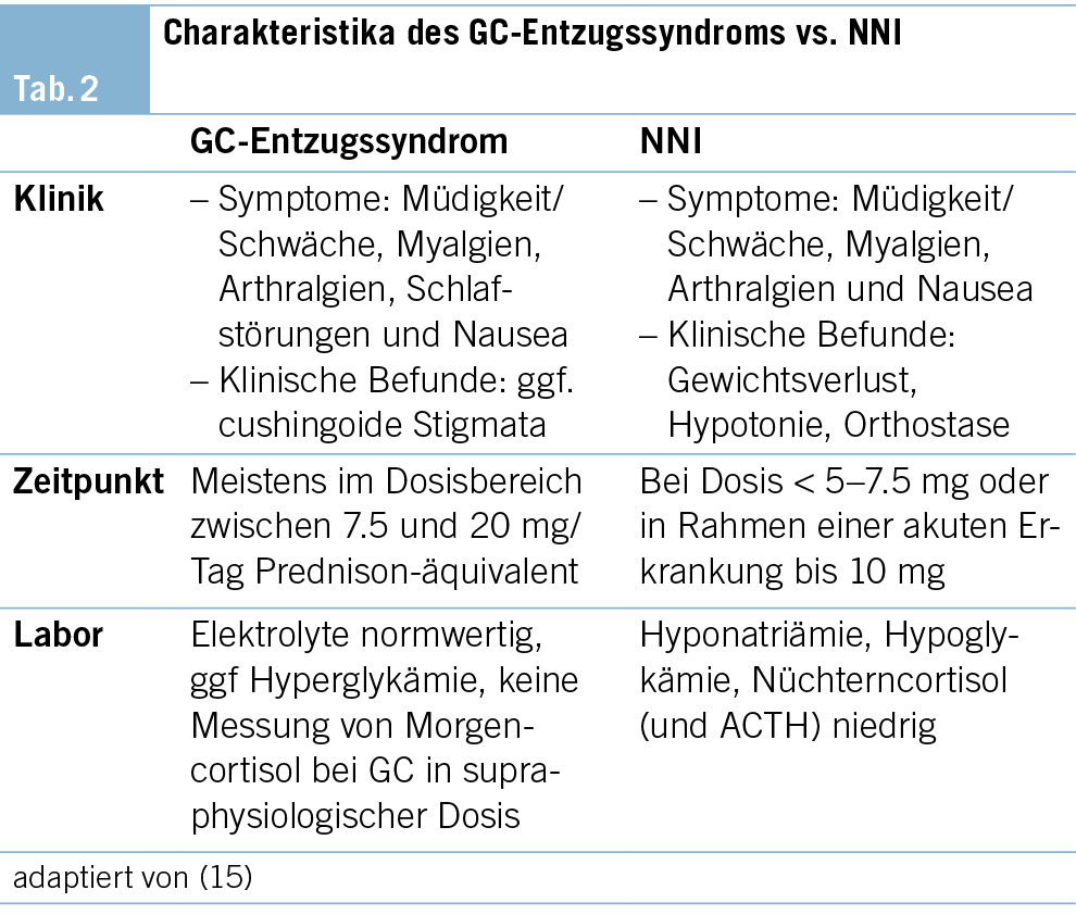 Bezüglich des Taperings wird vor allem auf die Wichtigkeit regelmässiger klinischer Kontrollen hinsichtlich des Auftretens von GC-Entzugssymptomen und deren Abgrenzung von einer Nebenniereninsuffizienz (Tab. 2) hingewiesen. Ein exaktes «Ausschleichschema» hat sich bis dato nicht etabliert, da diesbezüglich noch Vergleichsstudien fehlen, und dieses in Abhängigkeit der Risikofaktoren individualisiert werden sollte. Nach Erreichen der physiologischen Äquivalenzdosis werden in den Leitlinien allerdings zwei Vorgehensmöglichkeiten vorgeschlagen. Zum einen das Fortführen des Taperings in Mg-Schritten, zum anderen die Bestimmung des Nüchterncortisols zur Evaluation der endogenen Cortisolsekretion nach Erreichen einer Äquivalenzdosis von max. 20–30 mg Cortisol (5–7.5 mg Prednison). Obwohl kein optimaler Cut-off zwischen pathologischen und physiologischen Cortisolwerten besteht, wurde anhand der aktuellen Studienlage ein morgens nüchtern um 8 Uhr bestimmter Serumcortisolwert von 300 nmol/l vorgeschlagen, dessen Überschreiten ein sicheres Absetzen einer GC-Therapie erlaubt. Mit der Bestimmung müssen interferierende Faktoren, bspw. ein veränderter zirkadianer Rhythmus, Medikamente (orale Östrogene), besondere Situationen, die Einfluss auf die Gesamtcortisolbestimmung haben (Schwangerschaft, Leberzirrhose etc.), berücksichtigt werden. Eine aktuell laufende schweizerische multizentrische randomisierte und placebokontrollierte Studie (TOASST) wird künftig ebenso mehr Informationen bzgl. der Sicherheit eines abrupten Therapiestopps liefern können (15). Im Fall eines Taperings ohne biochemische Bestätigung der Erholung der HHN-Achse wird in den Leitlinien zudem der Einsatz einer peroralen/parenteralen Steroidstressprophylaxe in Stresssituationen oder bei klinischem V.a. Addison-Krise empfohlen. Die Durchführung eines ACTH-Stimulationstests ist nicht routinemässig empfohlen und besonderen Situationen vorbehalten.