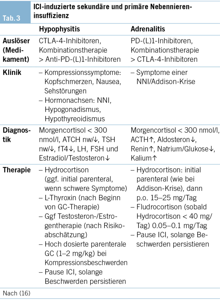 Patienten unter monoklonalen PD-(L)1-Inhibitoren oder Kombinationstherapie können in seltenen Fällen eine autoimmune Adrenalitis, z. T. mit Nachweis von Anti-21-Hydroxylase-Antikörpern, entwickeln. Diese tritt vermehrt bei Frauen und durchschnittlich 16 Wochen nach Therapiebeginn auf. Die Symptome sind zumeist, ähnlich anderer Formen der primären NNI, schwerwiegend und mit einer erhöhten Mortalität im Rahmen einer möglichen Addison-Krise verbunden. Die Diagnosestellung erfolgt vor allem klinisch, wobei die Messung eines tiefen Serumcortisols um 8 Uhr bei erhöhtem ACTH sowie niedrigem Aldosteron und erhöhtem Renin die Diagnose bestätigt und eine Hyponatriämie, Hypoglykämie und Hyperkaliämie hinweisend sind. Eine initial hoch dosierte parenterale Hydrocortisonsubstitution (wie bei Addison-Krise) ist in den meisten Fällen notwendig und kann im Verlauf auf eine Erhaltungsdosis von 15–25 mg Hydrocortison und Fludrocortison 0.05–0.1 mg/Tag p.o. umgestellt werden (Tab. 3) (18).