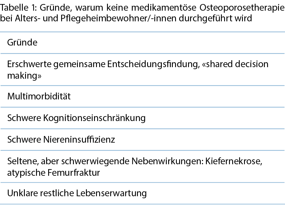 Zusammenfassung: Osteoporotische Frakturen bei älteren Personen sind häufig und sind bei älteren gebrechlichen Personen oft mit einem Umzug in Alters- und Pflegeheime verbunden. Nur wenige Altersheimbewohner/-innen mit dokumentierter Osteoporose erhalten eine medikamentöse Osteoporosetherapie. Es fehlen Studien, die den Nutzen einer medikamentösen Osteoporosetherapie bei dieser multimorbiden und vulnerablen Population aufzeigen.