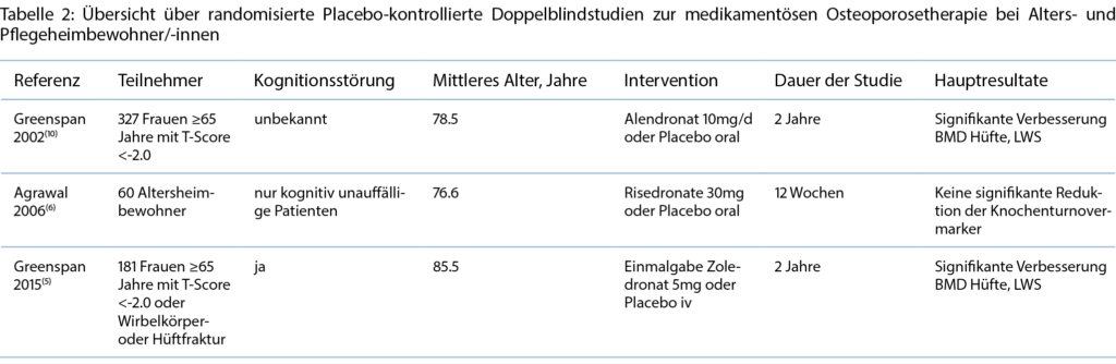 Bisher haben nur wenige Studien die Wirksamkeit einer pharmakologischen Osteoporosetherapie bei Alters- und Pflegeheimbewohner/-innen evaluiert (Tabelle 2.) Greenspan et al. zeigten 2002, dass Alendronat oral über zwei Jahre verglichen zu Placebo zu einer signifikanten Verbesserung der Knochendichte von Hüfte und LWS führte (10). In einer weiteren randomisierten Placebo-kontrollierten Doppelblindstudie von Altersheimbewohner/-innen mit Wirbelkörper- oder Hüftfrakturen oder mit einer verminderten Knochendichte kam es unter einmaliger intravenöser Zoledronat-Gabe zu einer signifikanten Knochendichteverbesserung (5). Beide Studien waren von der Studienteilnehmerzahl zu klein und auch nicht darauf ausgerichtet, eine Reduktion von Stürzen, funktionellen Outcomes oder Frakturen nachzuweisen (5, 10). Eine kleine randomisierte, doppelblinde Studie zeigte keinen Benefit einer wöchentlichen Gabe des oralen Bisphosphonates Risedronat verglichen zu Placebo bei kognitiv intakten Altersheimbewohner/-innen (6). Eine orale Gabe erscheint deshalb bei Personen in Langzeitinstitutionen obsolet. Es fehlen Interventionsstudien zu Denosumab, eine retrospektive Kohortenstudie von Altersheimbewohner/-innen mit Osteoporose und unter neu gestarter Therapie mit Zoledronat, Denosumab oder Teriparatid zeigte ein 46% niedrigeres Hüftfrakturrisiko unter Denosumab verglichen zu einer Therapie mit Teriparatid (11).