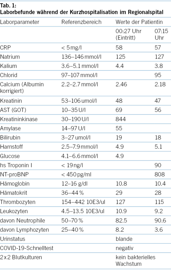Auffällig tiefer BMI von 13.5 kg/m2. Blutdruck 102/70 mmHg, Puls 99 bpm, 97 % Sauerstoffsättigung bei Atemfrequenz von 15/min und 40.2° C Körpertemperatur. Bei der Lymphknotenpalpation fiel einzig submandibulär rechts eine druckdolente Schwellung auf (im Zentrumsspital später sonographisch als Lymphadenopathie identifiziert). Das Abdomen war weich, diffus druckdolent, v.a. periumbilikal betont, ohne tastbare Organomegalie oder Abwehrspannung. Neurologisch wirkte die Patientin in der Interaktion verlangsamt. Sie war somnolent, jedoch allseits orientiert. Die Meningismusprüfung war schmerzhaft, aber nicht eindeutig positiv. Die Sensibilität der Extremitäten war normal, die Kraft wurde bei M4 eingestuft, und die Hirnnervenprüfung war unauffällig. Das Gangbild war nicht prüfbar wegen allgemeiner Schwäche. Kardiopulmonale Untersuchung, Otoskopie, Integument und enoral, bis auf etwas trockene Schleimhäute mit unauffälligen Befunden.