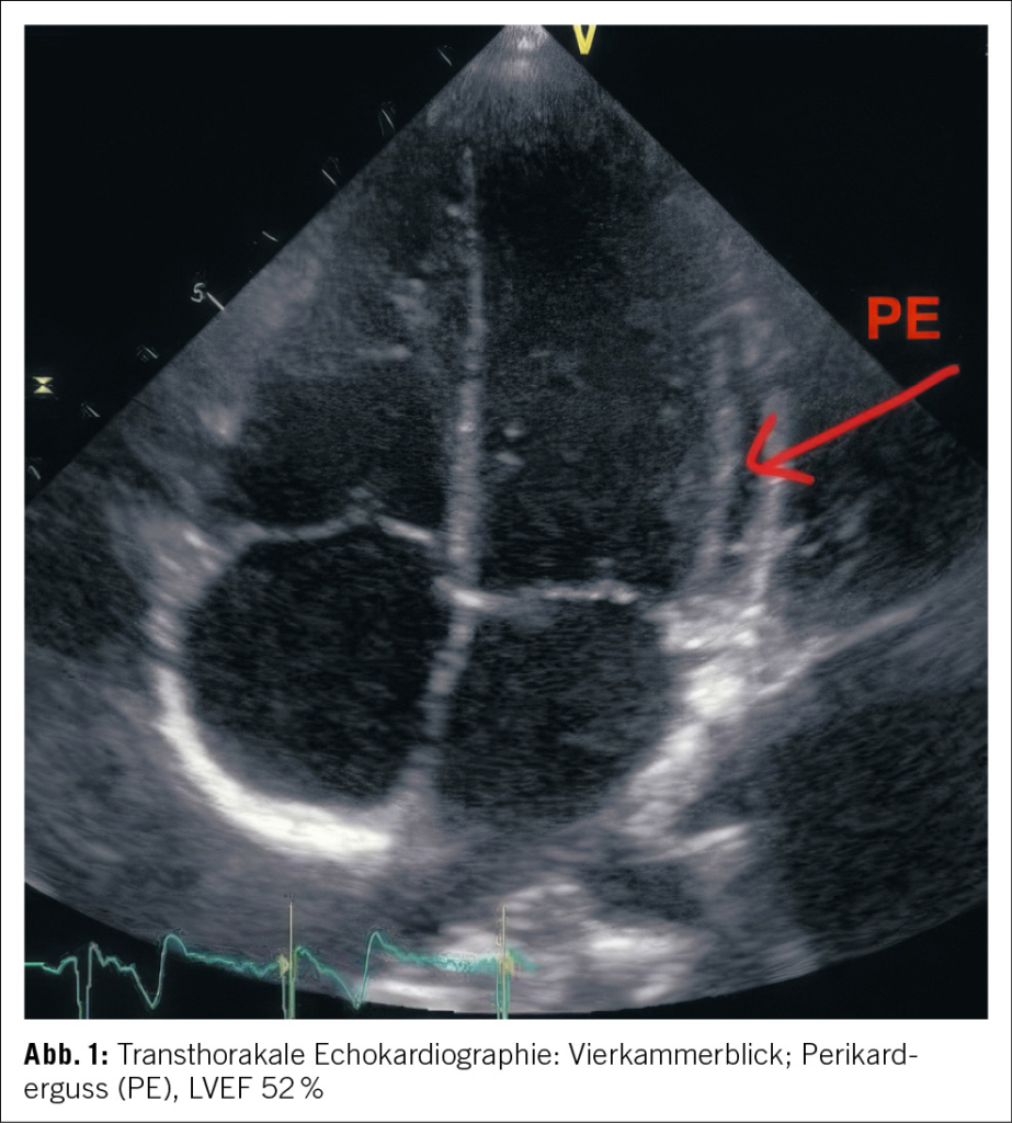 Aufgrund der Gesamtkonstellation wurde rasch die Verdachtsdiagnose eines PIMS-TS mit kardialer, gastrointestinaler, zentralnervöser und hämatologischer Beteiligung gestellt. Zur Diagnosestellung wurden die Kriterien der Schweizerischen Gesellschaft für Intensivmedizin verwendet (4). Im Folgelabor am nächsten Morgen erhärteten die erhöhten Werte von hs Troponin I und NT-proBNP, die charakteristische zunehmende Thrombo- und Lymphopenie und auch eine Hypochloridämie und Hypokalzämie die Verdachtsdiagnose (Tabelle 1). Eine transthorakale Echokardiographie zeigte einen kleinen Perikarderguss (Abbildung 1) und eine leichtgradig verminderte systolische linksventrikuläre Funktion (LVEF 52 %; Globaler Longitudinaler Strain –16 %).