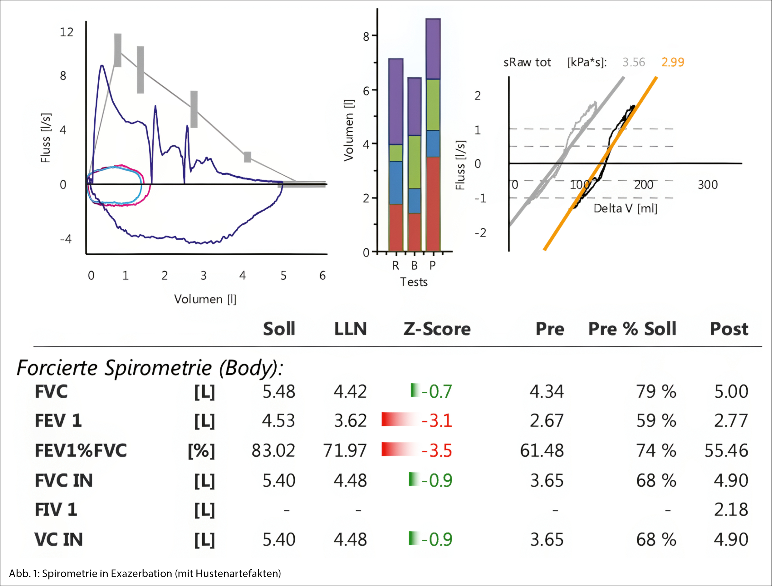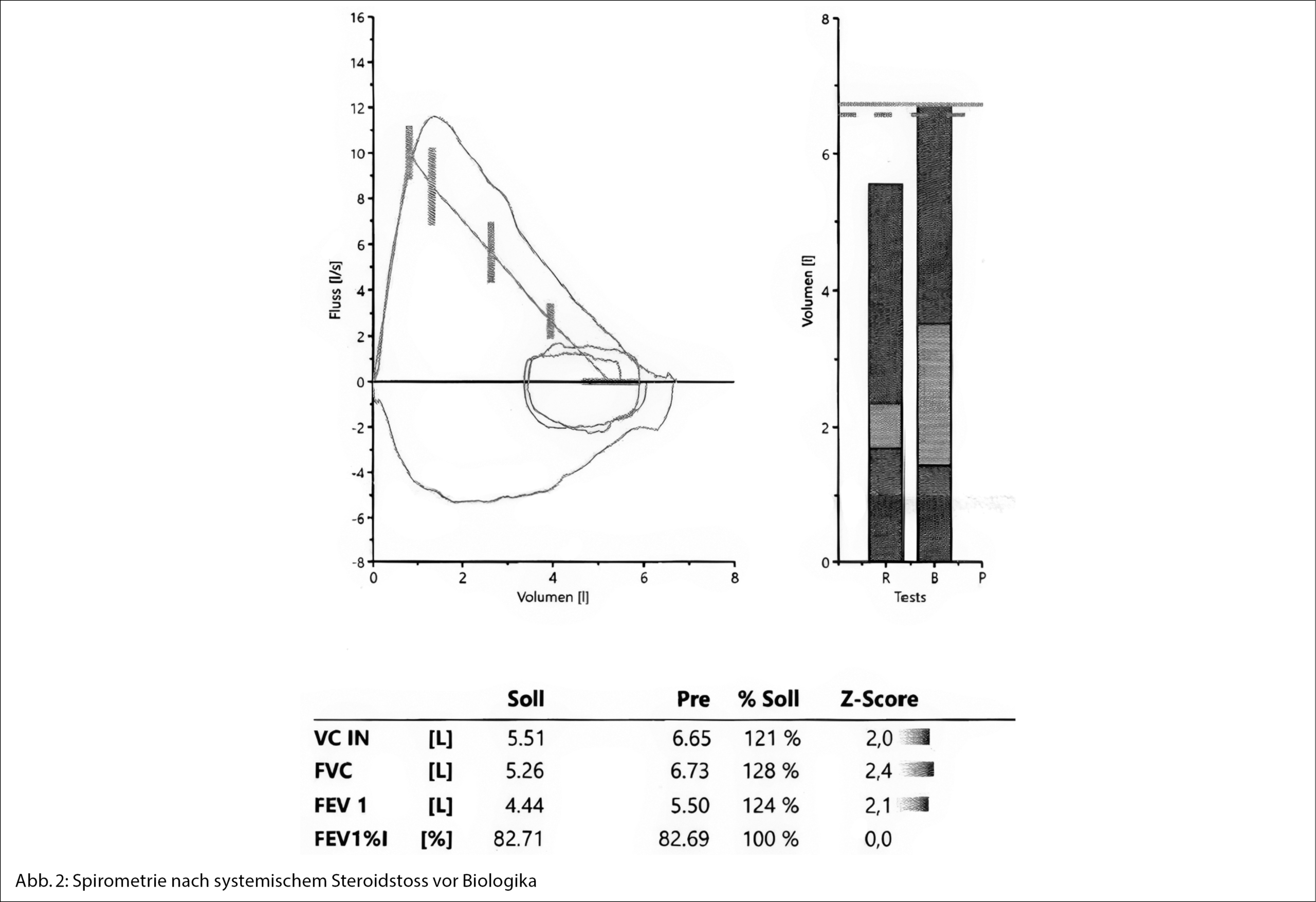 Bei erhöhter Eosinophilenzahl im Differenzialblutbild (2.6 G/l bzw. 24.9 %, Norm < 0.45 G/l bzw. 5 %), erhöhtem FeNO (exhaliertes Stickstoffmonoxid) von 107 ppb (Norm < 25 ppb) als weiterem Marker der Typ-2-Inflammation, negativem Inhalationsscreen (Phadia CAP sx1 0.18 kU/l, Norm < 0.7 kU/l) sowie wiederholt normwertigen ANCA (Anti Neutrophile Cytoplasmatische Antikörper) wurde trotz erhöhtem Gesamt-IgE (582 kU/l, Norm < 100 kU/l) die Diagnose eines nicht allergischen, eosinophilen adult-onset Asthmas gestellt und eine Behandlung gemäss GINA Stufe 4 eingeleitet. Dennoch kam es nach drei Monaten zu einer weiteren spontanen Exazerbation mit mittelschwerer, auf Betastimulatoren nicht reversibler Obstruktion. Unter OCS erfolgte erneut eine Normalisierung der Lungenfunktion mit absolutem FEV1-Anstieg (Erstsekundenkapazität) um 2.5 Liter (vgl. Abb. 1 und 2). (Man beachte Hustenartefakte als weiteres Zeichen der bronchialen Hyperreaktivität beim schlecht kontrollierten Asthma.)