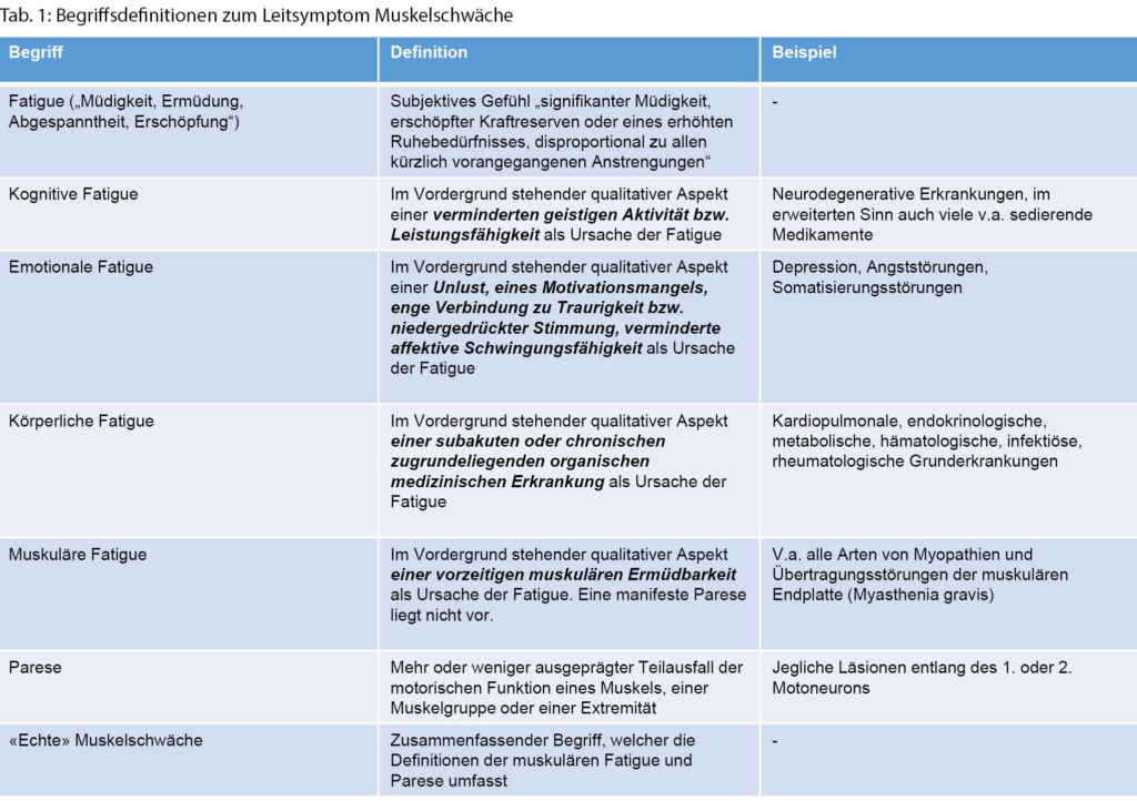 ◆ Die Unterscheidung einer «echten» Muskelschwäche (Parese oder muskuläre Fatigue) von einer allgemeinen Mattigkeit/Müdigkeit (Fatigue mit emotionalen, kognitiven oder körperlichen Subtypen, s.a. Definitionen in Tab. 1) oder Bewegungseinschränkung, die nicht auf eine Reduktion der Muskelkraft zurückzuführen ist.