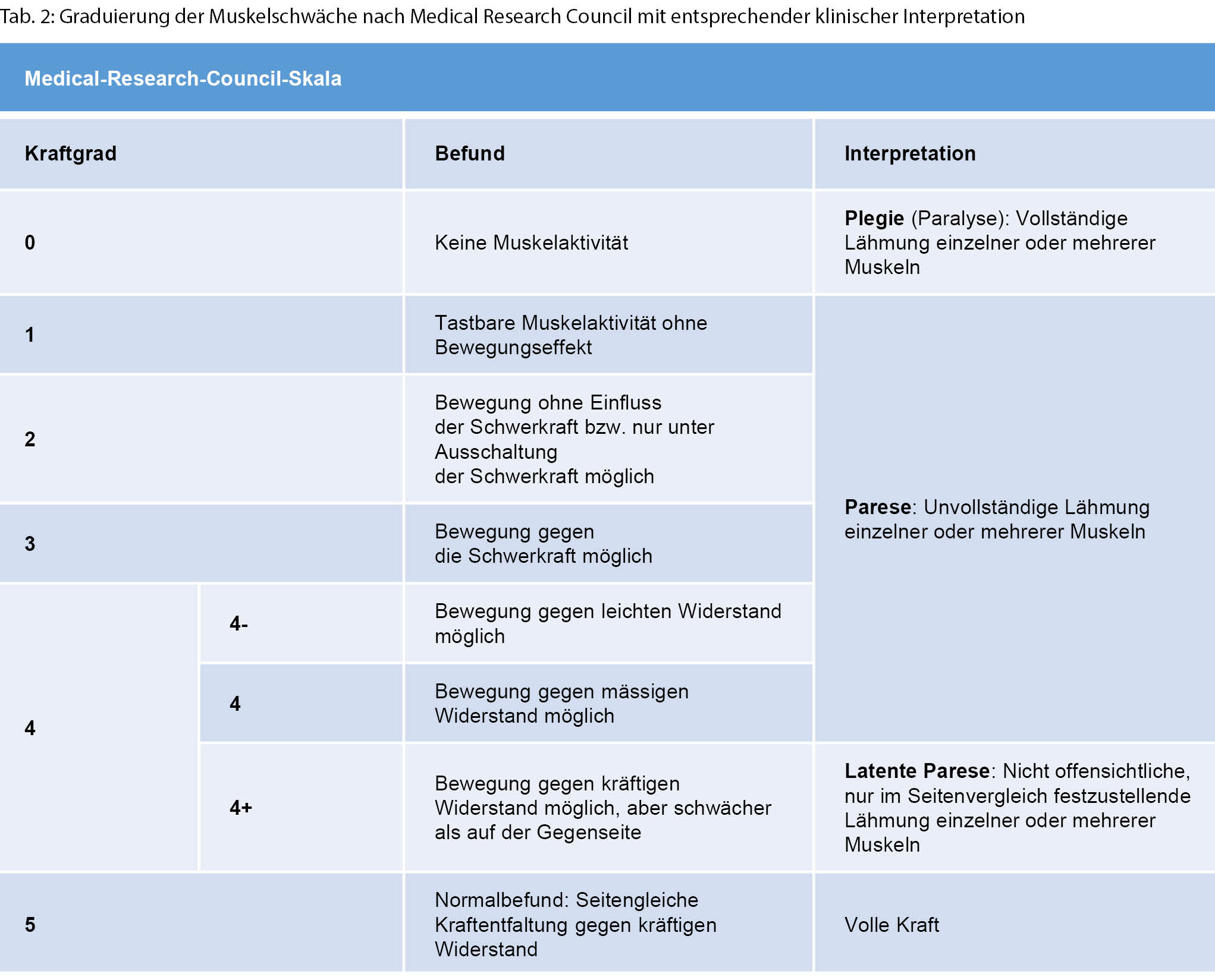 Eine Muskelschwäche wird durch eine formale Krafttestung objektiviert. Hierbei wird die Kraft ermittelt, die notwendig ist, um eine maximale Kraftentwicklung in einem Muskel zu überwinden. Etabliert hat sich hierbei eine Graduierung nach dem Medical Research Council von 0 bis 5 (Tab. 2) [3].