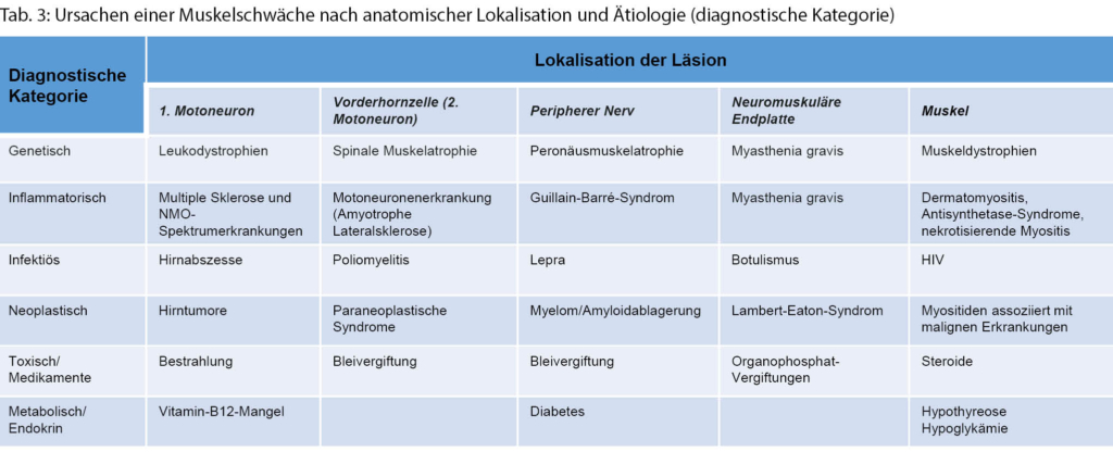 Ist die Muskelschwäche nun lokalisert und das Verteilungsmuster beschrieben, kann anhand weiterer Untersuchungsbefunde eine Kategorisierung zu einer genetischen, inflammatorischen/immunologischen, infektiösen, neoplastischen, toxischen oder metabolischen Ursache geschehen (Tabelle 3).