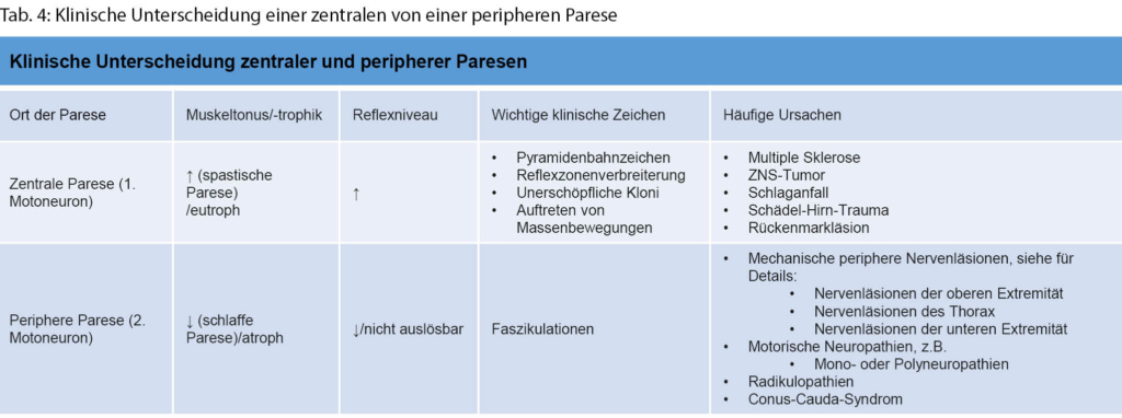 Um die mannigfaltigen Ursachen einer Muskelschwäche genauer eingrenzen zu können, bedarf es einer strukturierten Vorgehensweise und Einordnung gemäss der anatomischen Organisation des neuromuskulären Systems. Von zentral nach peripher beginnt diese mit dem motorischen Kortex und verläuft über den kortikospinalen Trakt, die Motoneurone im Vorderhorn und spinalen Nervenwurzeln zu den peripheren Nerven, der neuromuskulären Endplatte und schliesslich dem Muskel selbst (Tab. 3). Läsionen des zentralen vom peripheren Nervensystems können meistens gut durch eine neurologische Basisuntersuchung abgegrenzt werden (Tab. 4). Eine Untersuchung mittels Elektroneuromyografie (ENMG) kann helfen, unklare Untersuchungsbefunde zu objektivieren.