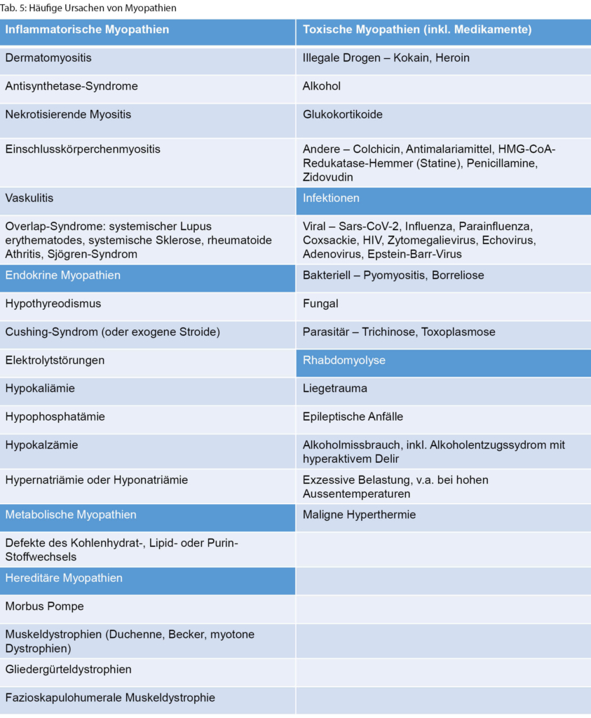 Die Hauptkategorien von Myopathien, die eine inflammatorische, endokrine, metabolische, toxische oder hereditäre Genese umfassen, sind, wie auch häufige Ursachen einer Rhabdomyolyse, in Tabelle 5 dargestellt.