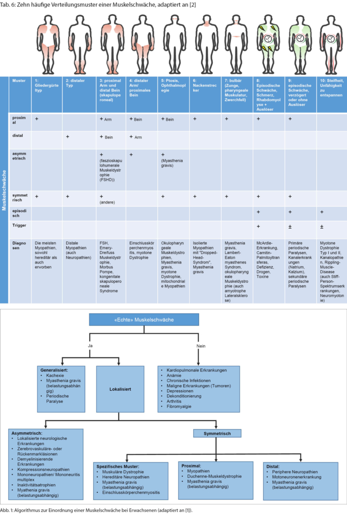 Wurde eine Muskelschwäche festgestellt, so sollte in einem weiteren Schritt das Verteilungsmuster beschrieben werden, um einer ätiologischen Diagnosestellung näher zu kommen (Abb. 1) [6].