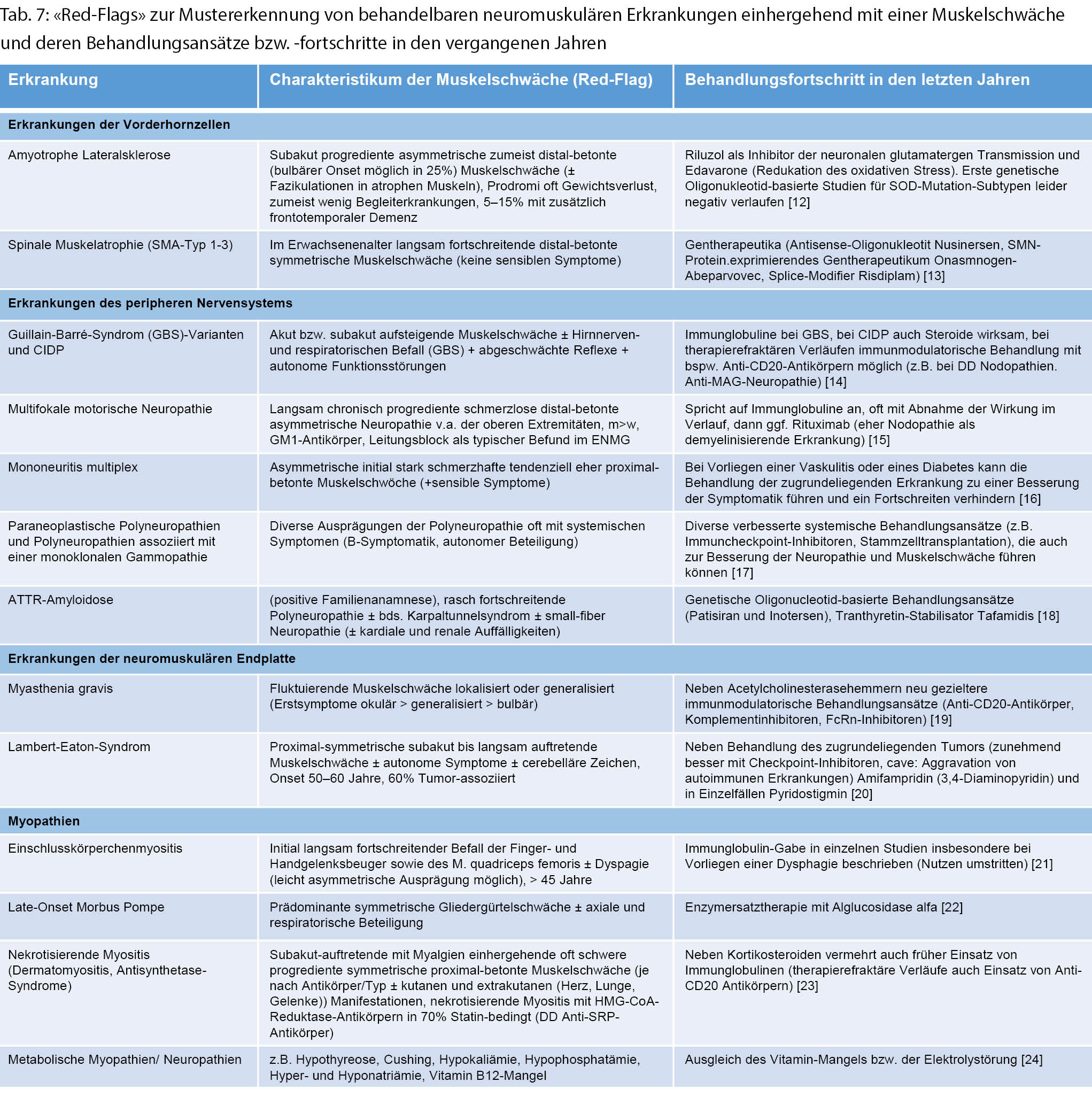 • Der erwähnte strukturierte Untersuchungsansatz einer Muskelschwäche ermöglicht hierbei das Erkennen von «Red Flags» für behandelbare Erkrankungen einhergehend mit einer Muskelschwäche, bei denen die Zuweisung an ein spezialisiertes Zentrum in der Regel sinnvoll ist.