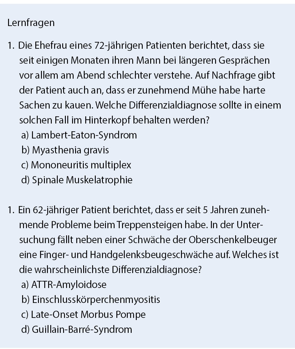 • Zur Lokalisation der Muskelschwäche eignen sich Algorithmen, die die Differenzialdiagnose mit Hilfe von weiteren anamnestischen Informationen über zeitlichen Verlauf und Schwere der Schwäche, über Begleiterkrankungen und -symptome, über Medikamenteneinnahme und familiäre Belastung einengen können